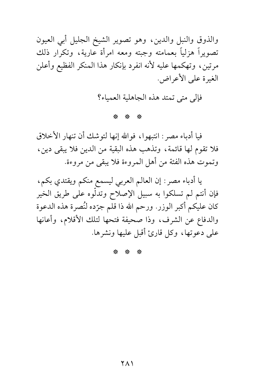 فيا أدباء مصر: انتبهوا، فوالله إنها لتوشك أن تنهار الأخلاق فلا تقوم لها قائمة، وتذهب هذه البقية من الدين فلا يبقى دين، وتموت هذه الفئة من أهل المروءة فلا يبقى من مروءة.