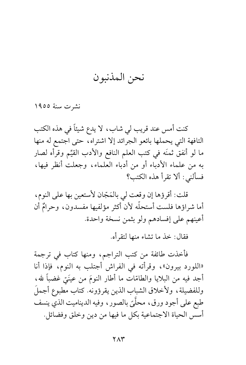 فأخذت طائفة من كتب التراجم، ومنها كتاب في ترجمة «اللورد بيرون»، وقرأته في الفراش أجتلب به النوم، فإذا أنا أجد فيه من البلايا والطامّات ما أطار النومَ من عينَيّ غضباً لله، وللفضيلة، ولأخلاق الشباب الذين يقرؤونه. كتاب مطبوع أجملَ طبع على أجود ورق، محلَّىً بالصور، وفيه الديناميت الذي ينسف أسس الحياة الاجتماعية بكل ما فيها من دين وخلق وفضائل.