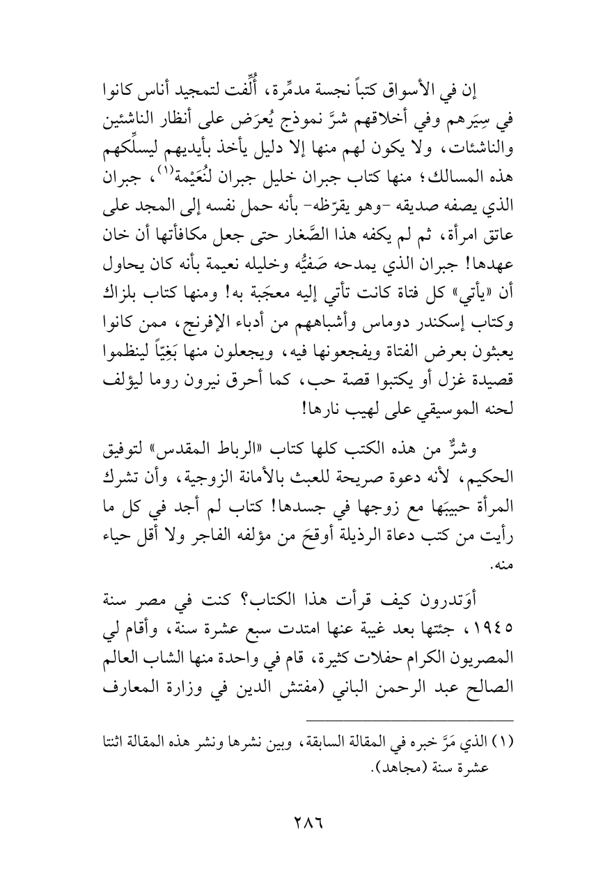 وشرٌّ من هذه الكتب كلها كتاب «الرباط المقدس» لتوفيق الحكيم، لأنه دعوة صريحة للعبث بالأمانة الزوجية، وأن تشرك المرأة حبيبَها مع زوجها في جسدها! كتاب لم أجد في كل ما رأيت من كتب دعاة الرذيلة أوقحَ من مؤلفه الفاجر ولا أقل حياء منه.