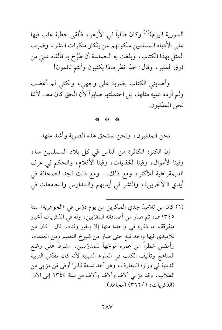 السورية اليوم) (¬1) وكان طالباً في الأزهر، فألقى خطبة عاب فيها على الأدباء المسلمين سكوتهم عن إنكار منكرات النشر، وضرب المثل بهذا الكتاب، وبلغت به الحماسة أن طوَّحَ به فألقاه عليّ من فوق المنبر، وقال: خذ انظر ماذا يكتبون وأنتم نائمون!