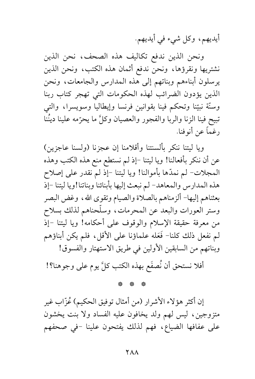 ونحن الذين ندفع تكاليف هذه الصحف، نحن الذين نشتريها ونقرؤها، ونحن ندفع أثمان هذه الكتب، ونحن الذين يرسلون أبناءهم وبناتهم إلى هذه المدارس والجامعات، ونحن الذين يؤدون الضرائب لهذه الحكومات التي تهجر كتاب ربنا وسنّة نبيّنا وتحكم فينا بقوانين فرنسا وإيطاليا وسويسرا، والتي تبيح فينا الزنا والربا والفجور والعصيان وكلَّ ما يحرّمه علينا دينُنا رغماً عن أنوفنا.
