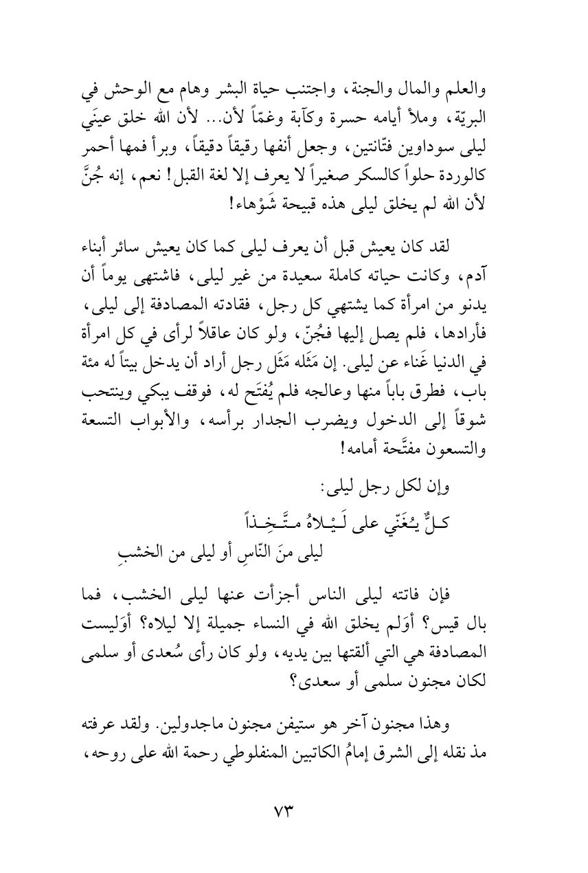 فإن فاتته ليلى الناس أجزأت عنها ليلى الخشب، فما بال قيس؟ أوَلم يخلق الله في النساء جميلة إلا ليلاه؟ أوَليست المصادفة هي التي ألقتها بين يديه، ولو كان رأى سُعدى أو سلمى لكان مجنون سلمى أو سعدى؟