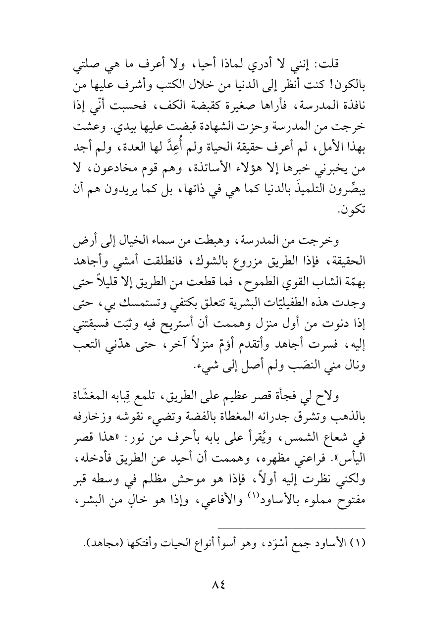 قلت: إنني لا أدري لماذا أحيا، ولا أعرف ما هي صلتي بالكون! كنت أنظر إلى الدنيا من خلال الكتب وأشرف عليها من نافذة المدرسة، فأراها صغيرة كقبضة الكف، فحسبت أنّي إذا خرجت من المدرسة وحزت الشهادة قبضت عليها بيدي. وعشت بهذا الأمل، لم أعرف حقيقة الحياة ولم أُعِدَّ لها العدة، ولم أجد من يخبرني خبرها إلا هؤلاء الأساتذة، وهم قوم مخادعون، لا يبصِّرون التلميذَ بالدنيا كما هي في ذاتها، بل كما يريدون هم أن تكون.