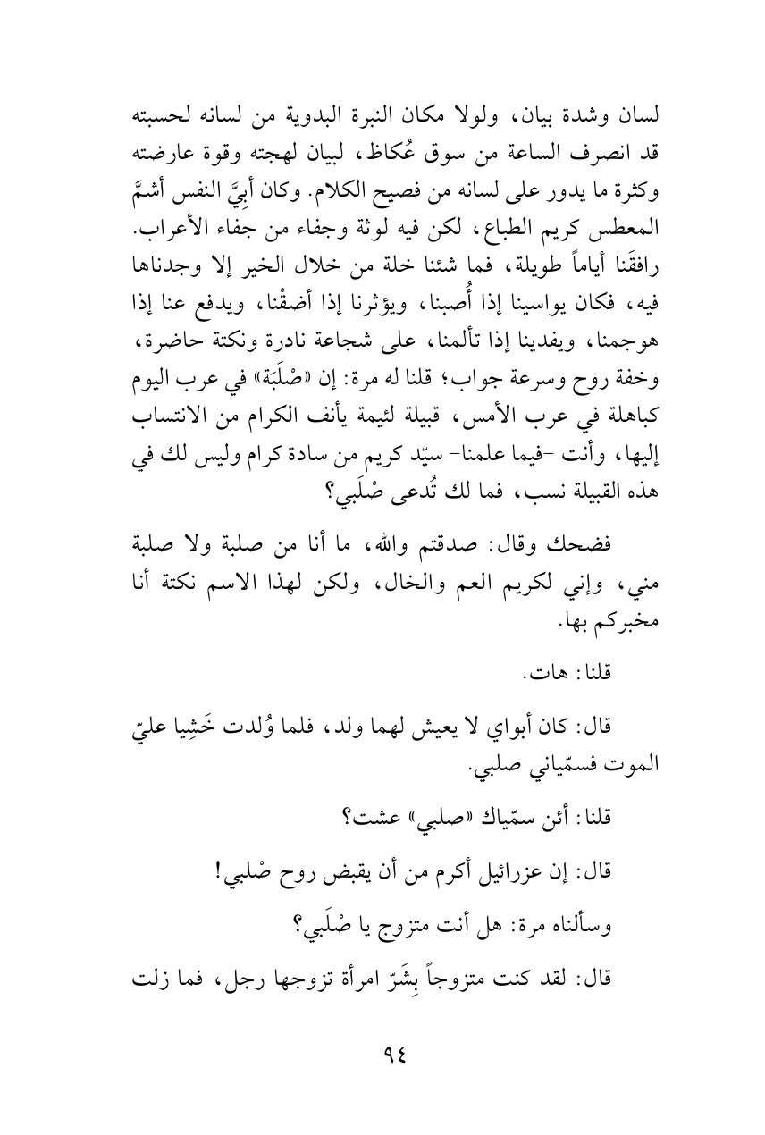 لسان وشدة بيان، ولولا مكان النبرة البدوية من لسانه لحسبته قد انصرف الساعة من سوق عُكاظ، لبيان لهجته وقوة عارضته وكثرة ما يدور على لسانه من فصيح الكلام. وكان أبِيَّ النفس أشمَّ المعطس كريم الطباع، لكن فيه لوثة وجفاء من جفاء الأعراب. رافقَنا أياماً طويلة، فما شئنا خلة من خلال الخير إلا وجدناها فيه، فكان يواسينا إذا أُصبنا، ويؤثرنا إذا أضقْنا، ويدفع عنا إذا هوجمنا، ويفدينا إذا تألمنا، على شجاعة نادرة ونكتة حاضرة، وخفة روح وسرعة جواب؛ قلنا له مرة: إن «صْلَبَة» في عرب اليوم كباهلة في عرب الأمس، قبيلة لئيمة يأنف الكرام من الانتساب إليها، وأنت -فيما علمنا- سيّد كريم من سادة كرام وليس لك في هذه القبيلة نسب، فما لك تُدعى صْلَبي؟