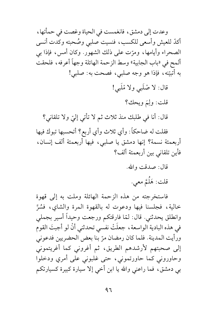 وعدت إلى دمشق، فانغمست في الحياة وغصت في حمأتها، أكدّ للعيش وأسعى للكسب، فنسيت صلبي وصُحبته وكدت أنسى الصحراء وأيامها، ومرّت على ذلك الشهور. وكان أمس، فإذا بي ألمح في «باب الجابية» وسط الزحمة الهائلة وجهاً أعرفه، فلحقت به أتبيّنه، فإذا هو وجه صلبي، فصحت به: صلبي!