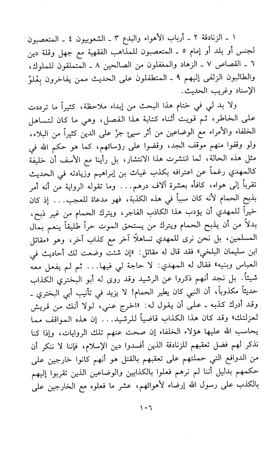 «أن النَّبِيَّ كَانَ يُطَيِّرُ الحَمَامَ!» لا يزيد في تأنيب أبي البختري - وقد أدرك كذبه - على أن يقول له: «أُخْرُجْ عَنِّي، لَوْلاَ أَنَّكَ مِنْ قُرَيْشٍ لَعَزَلْتُكَ» وقد كان هذا الكذاب قاضياً للرشيد ... إن هذه المواقف مِمَّا يحاسب الله عليها هؤلاء الخلفاء إِنْ صَحَّتْ عنهم تلك الروايات، وإذا كنا نذكر لهم فضل تَعَقُّبِهِمْ للزنادقة الذين أفسدوا دين الإسلام، فإننا لا ننكر أن من الدوافع التي حملتهم على تَعَقُّبِهِمْ بالقتل هو أنهم كانوا خارجين على حكمهم بدليل أننا لم نرهم فعلوا بِالكَذَّابِينَ وَالوَضَّاعِينَ الذين تقربوا إليهم بالكذب على رسول الله إِرْضَاءً لأهوائهم، عُشْرَ ما فعلوه مع الخارجين على