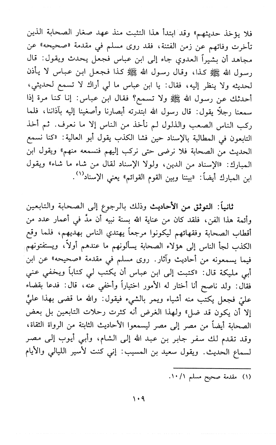 فَلاَ يُؤْخَذُ حَدِيثُهُمْ» وقد ابتدأ هذا التثبت منذ عهد صغار الصحابة الذين تأخرت وفاتهم عن زمن الفتنة، فقد روى مسلم في " مقدمة صحيحه " عَنْ مُجَاهِدٍ أَنَّ بُشَيْرًا العَدَوِيَّ إِلَى ابْنِ عَبَّاسٍ فَجَعَلَ يُحَدِّثُ وَيَقُولُ: قَالَ رَسُولُ اللهِ - صَلََّى اللهُ عَلَيْهِ وَسَلَّمَ - كَذَا، وَقَالَ رَسُولُ اللهِ - صَلََّى اللهُ عَلَيْهِ وَسَلَّمَ - كَذَا، فَجَعَلَ ابْنُ عَبَّاسٍ لا يَأْذَنُ لِحَدِيثِهِ، ولا يَنْظُرُ إِلَيْهِ، فَقَالَ: «يَا ابْنَ عَبَّاسٍ، مَالِي لا أَرَاكَ تَسْمَعُ لِحَدِيثِي؟ أُحَدِّثُكَ عَنْ رَسُولِ اللَّهِ ولا تَسْمَعُ»، فَقَالَ ابْنُ عَبَّاس: «إِنَّا كُنَّا مَرَّةً إِذَا سَمِعْنَا رَجُلاً يَقُولُ قَالَ رَسُولُ اللَّهِ، ابْتَدَرَتْهُ أَبْصَارُنَا، وَأَصْغَيْنَا إِلَيْهِ بِآذَانِنَا، فَلَمَّا رَكِبَ النَّاسُ الصَّعْبَ وَالذَّلُولَ، لَمْ نَأْخُذْ مِنْ النَّاسِ إلاَّ مَا نَعْرِفُ». ثم أخذ التابعون في المطالبة بالإسناد حين فشا الكذب يقول أبو العالية: «كُنَّا نَسْمَعُ الحَدِيثَ مِنَ الصَّحَابَةِ فَلاَ نَرْضَى حَتَّى نَرْكَبَ إِلَيْهِمْ فَنَسْمَعَهُ مِنْهُمْ» ويقول ابن المبارك: «الإِسْنَادُ مِنَ الدِّينِ، وَلَوْلاَ الإِسْنَادُ لَقَالَ مَنْ شَاءَ مَا شَاءَ». ويقول ابن المبارك أيضاًً: «بَيْنَنَا وَبَيْنَ الْقَوْمِ الْقَوَائِمُ» يعني الإسناد (¬1).