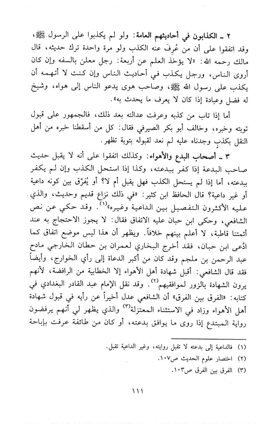 3 - أصحاب البدع والأهواء: وكذلك اتفقوا على أنه لا يقبل حديث صاحب البدعة إذا كفر ببدعته، وكذا إذا استحل الكذب وإن لم يكفر ببدعته، أما إذا لم يستحل الكذب فهل يقبل أم لا؟ أو يُفرِّق بين كونه داعية أو غير داعية؟ قال الحافظ ابن كثير: «فِيْ ذَلِكَ نِزَاعٌ بَيْنَ قَدِيمٍ وَحَدِيثٍ، وَالذِي عَلَيْهِ الأَكْثَرُونَ التَّفْصِيلُ بَيْنَ الدَّاعِيَةِ وَغَيْرِهِ (¬1). وَقَدْ حُكِيَ عَنْ نَصِّ الشَّافِعِيِّ، وَحَكَى ابْنُ حِبَّانَ عَلَيْهِ الاتِّفَاقَ فَقَالَ: " لاَ يَجُوزُ الاحْتِجَاجُ بِهِ عِنْدَ أَئِمَّتِنَا قَاطِبَةً، لاَ أَعْلَمُ بَيْنَهُمْ خِلاَفًا ". وَيَظْهَرُ أَنَّ هَذَا لَيْسَ مَوْضِعِ اتِّفَاقٍ كَمَا ادَّعَى ابْنُ حِبَّانَ، فَقَدْ أَخْرَجَ البُخَارِيُّ لِعِمْرَانَ بْنِ حَطَّانَ الخَارِجِيَِّ مَادِحَ عَبْدِ الرَّحْمَنِ بْنِ مُلْجِمٍ وَقَدْ كَانَ مِنْ أَكْبَرِ الدُّعَاةِ إِلَى رَأْيِ الْخَوَارِجِ، وَأَيِضَا فَقَدْ قَالَ الشَّافِعِيُّ: " أَقْبَلُ شَهَادَةَ أَهْلِ الأَهْوَاءِ إِلاَّ الخَطَّابِيَّةَ مِنَ الرَّافِضَةِ، لأَنَّهُمْ يَرَوْنَ الشَّهَادَةَ بِالزُّورِ لِمُوَافِقِيهِمْ "» (¬2).