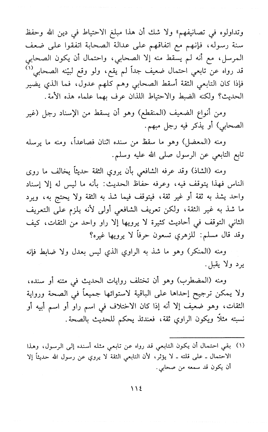 ومنه (الشَاذُّ) وقد عَرَّفَهُ الشافعي بأن يروي الثِّقَةُ حَدِيثًا يخالف ما روى الناس فهذا يتوقف فيه، وَعَرَّفَهُ حُفَّاظُ الحَدِيثِ: بأنه ما ليس له إلا إسناد واحد يشذ به ثقة أو غير ثقة، فيتوقف فيما شذ به الثقة ولا يحتج به، ويرد ما شذ به غير الثقة. ولكن تعريف الشافعي أولى لأنه يلزم على التعريف الثاني التوقف في أحاديث كثيرة لا يرويها إلا رَاوٍ واحد من الثقات، كيف وقد قال مسلم: «لِلْزُّهْرِيِّ تِسْعُونَ حَرْفًا لاَ يَرْوِيهَا غَيْرُهُ»؟