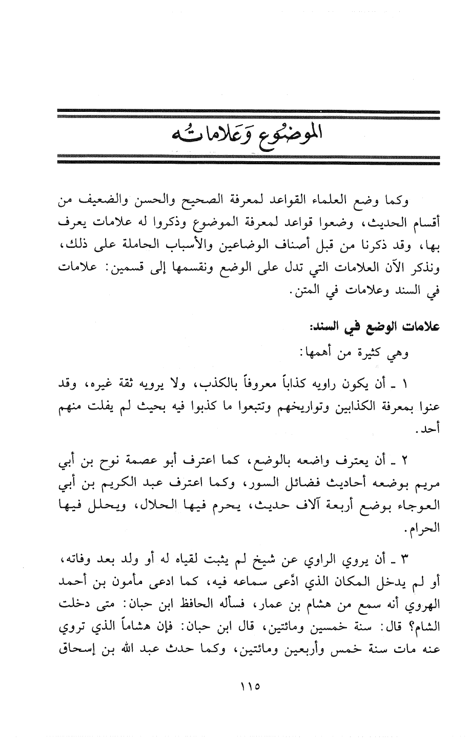 وكما وضع العلماء القواعد لمعرفة الصحيح والحسن والضعيف من أقسام الحديث، وضعوا قواعد لمعرفة الموضوع وذكروا له علامات يعرف بها، وقد ذكرنا من قبل أصناف الوَضَّاعِينَ والأسباب الحاملة على ذلك، ونذكر الآن العلامات التي تدل على الوضع وَنُقَسِّمُهَا إلى قسمين: علامات في السند وعلامات في المتن.