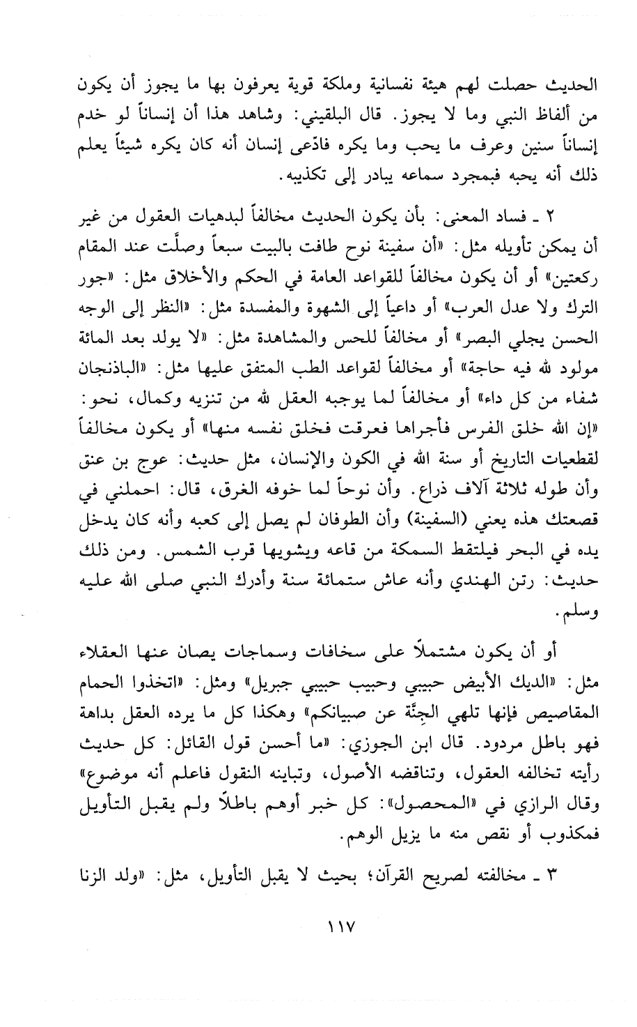 أو يكون مشتملاً على سخافات وسماجات يصان عنها العقلاء مثل «الدِّيكُ الأَبْيَضُ حَبِيبِي وَحَبِيبُ حَبِيبِي جِبْرِيلُ» ومثل «اتَّخِذُوا الحَمَامَ المَقَاصِيصَ فَإِنَّهَا تُلْهِي الجِنَّةَ عَنْ صِبْيَانِكُمْ» وهكذا كل ما يَرُدُّهُ العقل بداهة فهو باطل مردود.