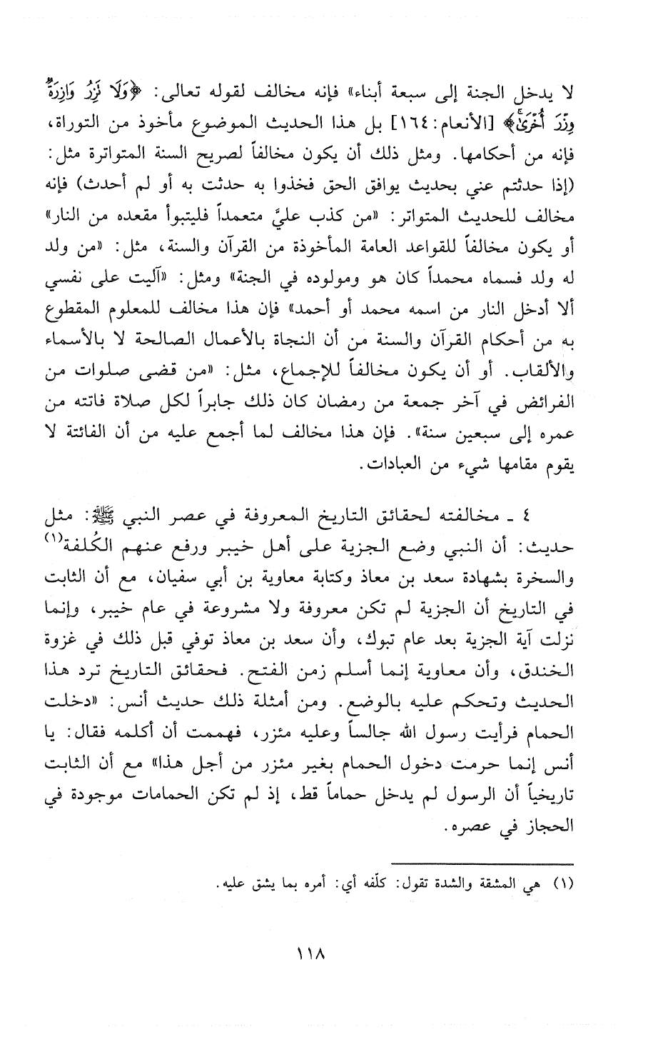 مثل حديث «أن النَّبِيَّ وَضَعَ الجِزْيَةِ عَلَىَ أَهْلِ خَيْبَرَ وَرَفَعَ عَنْهُمْ الْكُلْفَةَ (¬2) وَالْسُّخْرَةَ بِشَهَادَةِ سَعْدِ بْنِ مُعَاذٍ وَكِتَابَةِ مُعَاوِيَةَ بْنِ أَبِي سُفْيَانَ»، مع أن الثابت في التاريخ أن الجزية لم تكن معروفة ولا مشروعة في عام خيبر، وإنما نزلت آية الجزية بعد عام تبوك، وأن سعد بن معاذ تُوُفِّيَ قبل ذلك في غزوة الخندق، وأن معاوية إنما أسلم زَمَنَ الفتح. فحقائق التاريخ ترد هذا الحديث وتحكم عليه بالوضع. ومن أمثلة ذلك حديث أنس في «دَخَلْتُ الحَمَّامَ فَرَأَيْتُ رَسُولَ اللهِ جَالِسًا وَعَلَيْهِ مِئْزَرٌ، فَهَمَمْتُ أَنْ أُكَلِّمَهُ فَقَالَ: " يَا أَنَسُ إِنَّمَا حَرَّمْتُ دُخُولَ الحَمَّامَ بِغَيْرِ مِئْزَرٍ مِنْ أَجْلِ هَذَا "» مع أن الثابت تاريخياً أن الرسول لم يدخل حمَّاماً قَطُّ، إذ لم تكن الحَمَّامَاتُ موجودة في الحجاز في عصره.