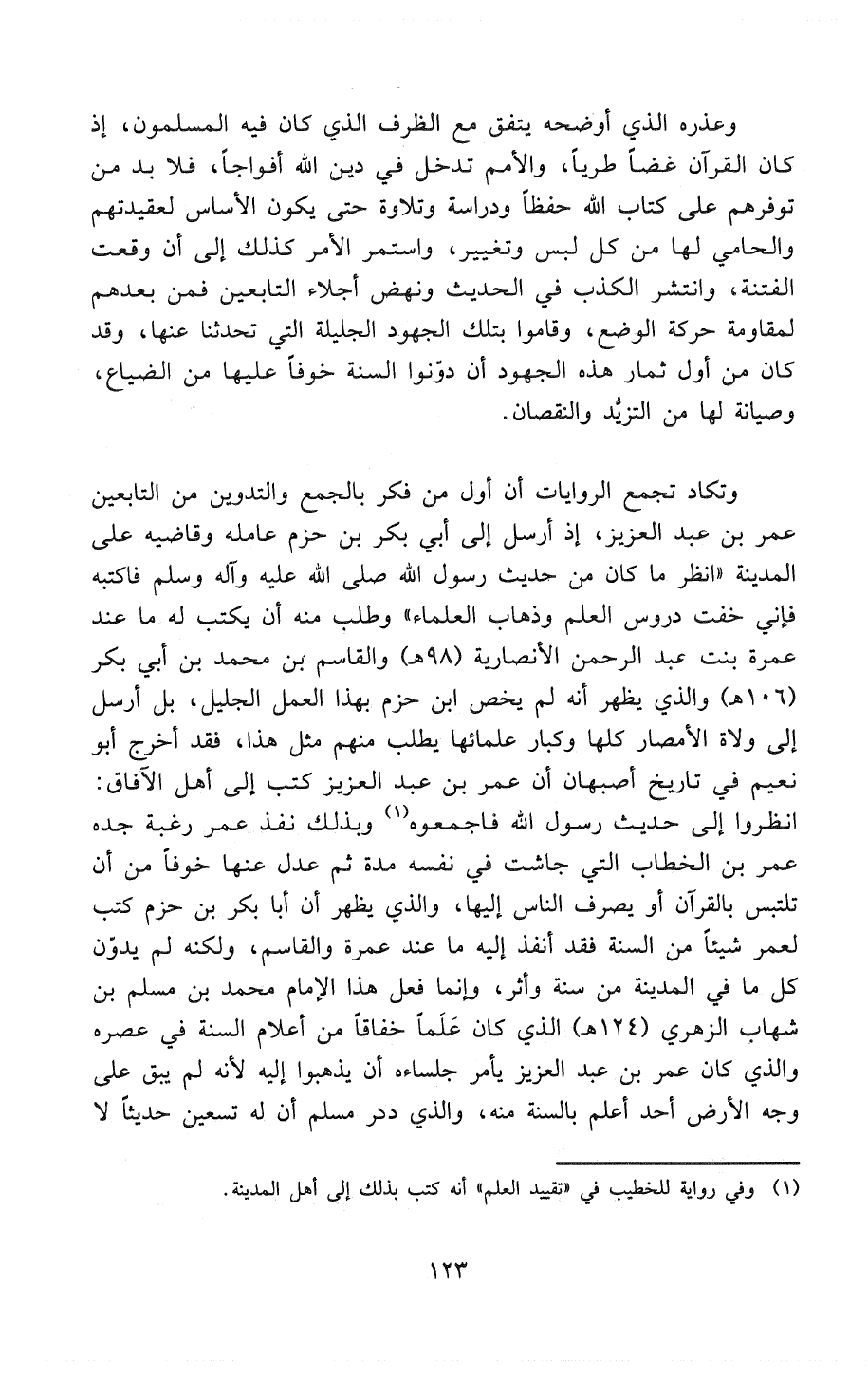 وتكاد تجمع الروايات أن أول من فكر بالجمع والتدوين من التَّابِعِينَ عمر بن عبد العزيز، إذ أرسل إلى أبي بكر بن حزم عامله وقاضيه على المدينة «انْظُرْ مَا كَانَ مِنْ حَدِيثِ رَسُولِ اللَّهِ - صَلَّى اللهُ عَلَيْهِ وَسَلَّمَ - فَاكْتُبْهُ، فَإِنِّي خِفْتُ دُرُوسَ العِلْمِ، وَذَهَابَ العُلَمَاءِ» وطلب منه أن يكتب له ما عند عَمْرَةَ بِنْتَ عَبْدِ الرَحْمَنِ الأَنْصَارِيَّةَ (98 هـ) والقاسم بن محمد بن أبي بكر (106 هـ) والذي يظهر أنه لم يخص ابن حزم بهذا العمل الجليل، بل أرسل إلى ولاة الأمصار كلها وكبار علمائها يطلب منهم مثل هذا، فقد أخرج أبو نعيم في " تاريخ أصبهان " أَنَّ عُمَرَ بْنِ عَبْدِ العَزِيزِ كَتَبَ إِلَى أَهْلِ الآفَاقِ: «انْظُرُوا إِلَى حَدِيثِ رَسُولِ اللهِ فَاجْمَعُوهُ» (¬1) وبذلك نَفَّذَ عمر رغبة جَدِّهِ عمر بن الخطاب التي جاشت في نفسه مُدَّةً ثم عدل عنها خوفاً من أن تلتبس بالقرآن أو يصرف الناس إليها، والذي يظهر أن أبا بكر بن حزم كتب لعمر شيئاً مِنَ السُنَّةِ فقد أنفذ إليه ما عند عَمْرَةَ والقاسم، ولكنه لم يُدَوِّنُ كل ما في المدينة من سُنَّةٍ وَأَثَرٍ، وإنما فعل هذا الإمام محمد بن مسلم بن شهاب الزُّهْرِيِّ (124 هـ) الذي كان عَلَماً خفَّاقاً من أعلام السُنَّةِ في عصره والذي كان عمر بن عبد العزيز يأمر جلساءه أن يذهبوا إليه لأنه لم يبق على وجه الأرض أحد أعلم بِالسُنَّةِ منه، والذي ذكر " مسلم " أن له تسعين حَدِيثًا لا