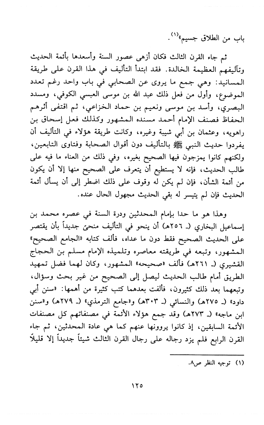وهذا هو ما حدا بإمام المُحَدِّثِينَ وَدُرَّةَ السُنَّةِ في عصره محمد بن إسماعيل البخاري (- 256 هـ) أن ينحو في التأليف مَنْحًى جديداً بأن يقتصر على الحديث الصحيح فقط دُونَ ما عداه، فألَّفَ كتابه " الجامع الصحيح " المشهور، وتبعه في طريقته معاصره وتلميذه الإمام مُسْلِمٌ بْنُ الحَجَّاجِ القُشَيْرِيُّ (- 261 هـ) فألَّفَ " صحيحه " المشهور، وكان لهما فضل تمهيد الطريق أمام طالب الحديث ليصل إلى الصحيح من غير بحث وسؤال، وتبعهما بعد ذلك كثيرون، فأُلِّفَتْ بعدهما كتب كثيرة من أهمها: " سُنن أبي داود " (- 275 هـ) و" النسائي " (- 303 هـ) و" جامع الترمذي " (- 279 هـ) و" سُنن ابن ماجه " (- 273 هـ) وقد جمع هؤلاء الأئمة في مُصَنَّفَاتِهِمْ كُلَّ مُصَنَّفَاتِ الأئمة السابقين، إذ كانوا يروونها كما هي عادة المُحَدِّثِينَ، ثم جاء القرن الرابع فلم يزد رجاله على رجال القرن الثالث شيئاً جديداً إلا قليلاً