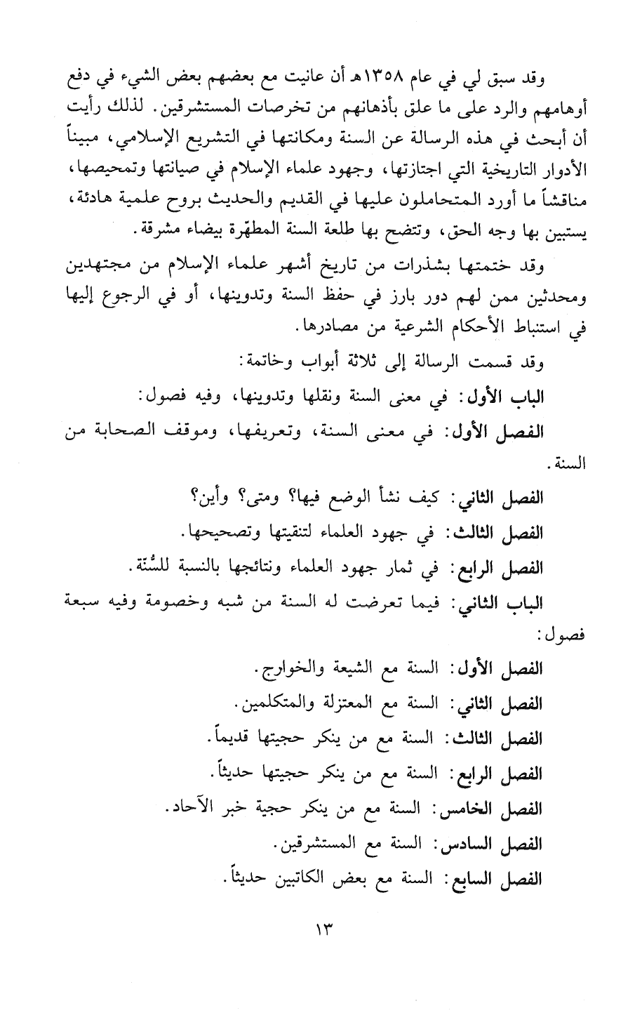 وقد سبق لي في عام 1358 هـ أن عانيت مع بعضهم بعض الشيء في دفع أوهامهم والرد على ما علق بأذهانهم من تَخَرُّصَاتِ المُسْتَشْرِقِينَ. لذلك رأيت أن أبحث في هذه الرسالة عن السُنَّةِ ومكانتها في التشريع الإسلامي، مُبَيِّنًا الأدوار التاريخية التي اجتازتها، وجهود علماء الإسلام في صيانتها وتمحيصها، مناقشًا ما أورد المتحاملون عليها في القديم والحديث بروح علمية هادئة، يستبين بها وجه الحق، وتتضح بها طلعة السُنَّةِ المُطَهَّرَةِ بيضاء مشرقة.