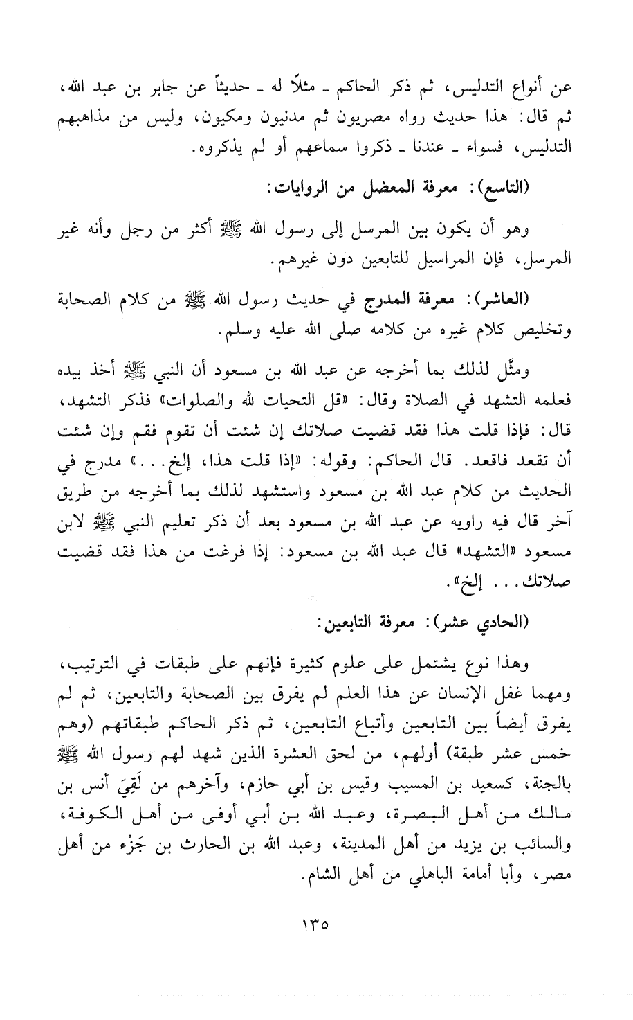 وهذا نوع يشتمل على علوم كثيرة فإنهم على طبقات في الترتيب، ومهما غفل الإنسان عن هذا العلم لم يُفَرِّقْ بين الصحابة والتَّابِعِينَ، ثم لم يُفَرِّقْ أيضاًً بين التَّابِعِينَ وأتباع التَّابِعِينَ، ثم ذكر الحاكم طبقاتهم (وهم خمس عشرة طبقة) أولهم، من لحق العشرة الذين شهد لهم رسول الله - صَلََّى اللهُ عَلَيْهِ وَسَلَّمَ - بالجنة، كسعيد بن المسيب وقيس بن أبي حازم، وآخرهم من لَقِيَ أنس بن مالك من أهل البصرة، وعبد الله بن أبي أوفى من أهل الكوفة، والسائب بن يزيد من أهل المدينة، وعبد الله بن الحارث بن جُزْءٍ من أهل مصر، وأبا أمامة الباهلي من أهل الشام.