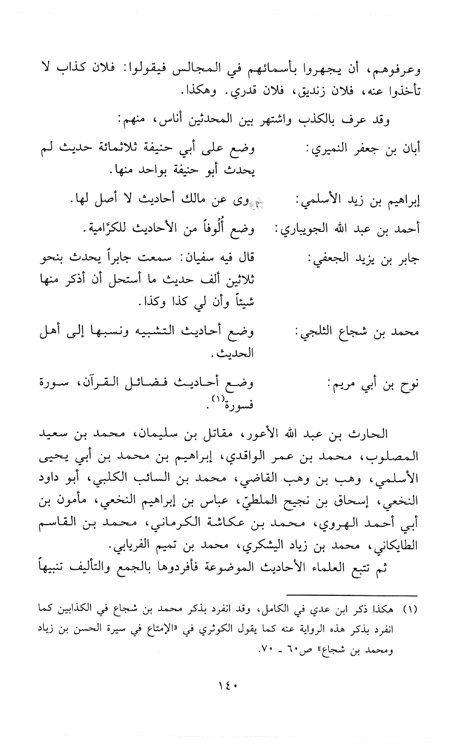 (¬1) هكذا ذكر ابن عدي في " الكامل ". وقد انفرد بذكر محمد بن شجاع في الكَذَّابِينَ كما انفرد بذكر هذه الرواية عنه كما يقول الكوثري في " الإمتاع في سيرة الحسن بن زياد ومحمد بن شجاع» ص 60 - 70.