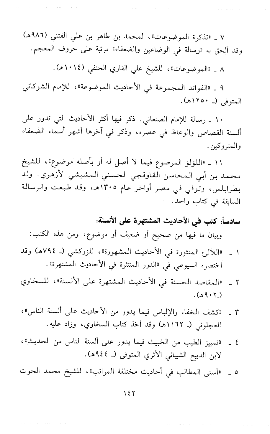 7 - " تذكرة الموضوعات "، لمحمد بن طاهر بن علي الفُتَّنِي (986) وقد ألحق به رسالة في الوَضَّاعِينَ والضعفاء مرتبة على حروف المعجم.