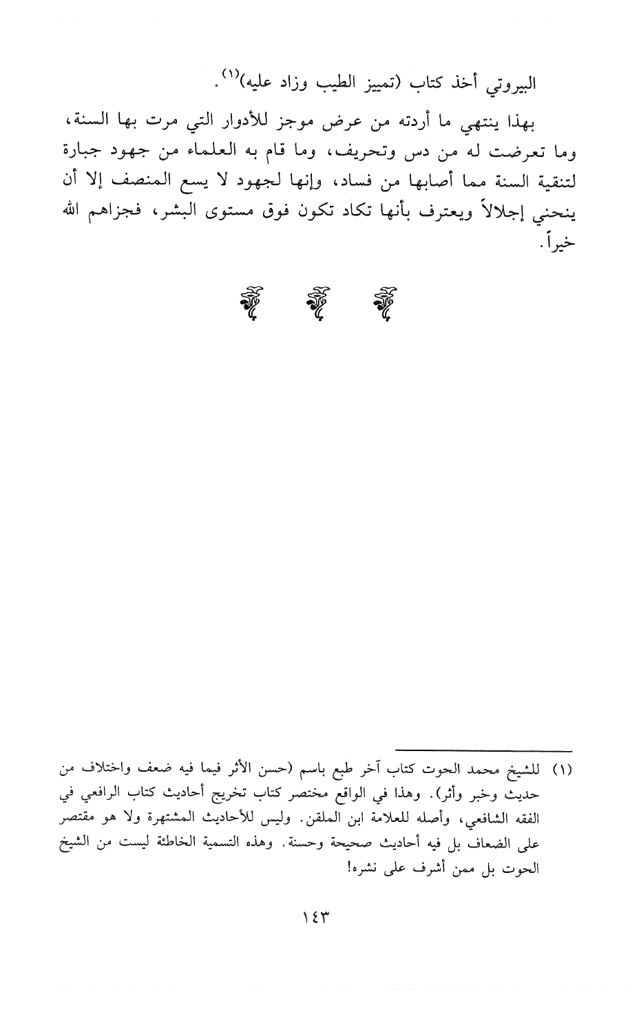 (¬1) للشيخ محمد الحوت كتاب آخر طبع باسم " حسن الأثر فيما فيه ضعف واختلاف من حديث وخبر وأثر ". وهذا في الواقع مختصر كتاب " تخريج أحاديث كتاب الرافعي " في الفقه الشافعي، وأصله للعلامة ابْنِ المُلَقَّنْ. وليس للأحاديث المشتهرة ولا هو مقتصر على الضعاف بل فيه أحاديث صحيحة وحسنة. وهذه التسمية الخاطئة ليست من الشيخ الحوت بل مِمَّنْ أشرف على نشره!