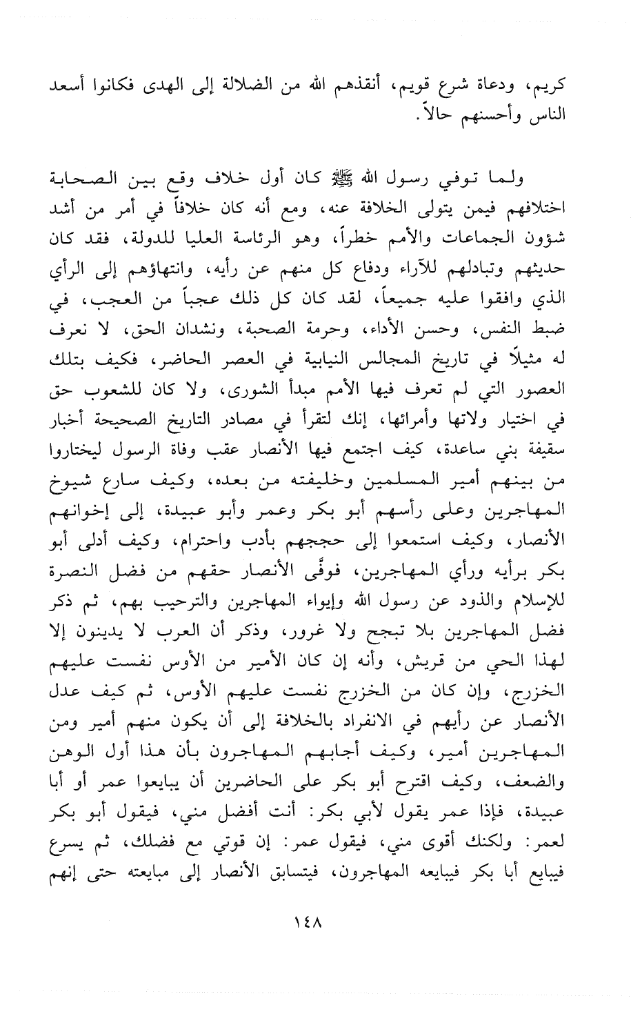 ولما توفي رسول الله - صَلََّى اللهُ عَلَيْهِ وَسَلَّمَ - كان أول خلاف وقع بين الصحابة اختلافهم فيمن يتولى الخلافة عنه، ومع أنه كان خلافاً في أمر من أشد شؤون الجماعات والأمم خطراً، وهو الرئاسة العليا للدولة، فقد كان حديثهم وتبادلهم للآراء ودفاع كل منهم عن رأيه، وانتهاؤهم إلى الرأي الذي وافقوا عليه جميعا، لقد كان كل ذلك عجباً من العجب، في ضبط النفس، وحُسن الأداء، وحرمة الصحبة، ونشدان الحق، لا تعرف له مثيلا في تاريخ المجالس النيابية في العصر الحاضر، فكيف بتلك العصور التي لم تعرف فيها الأمم مبدأ الشورى، ولا كان للشعوب حق في اختيار وُلاَّتِهَا وأمرائها، إنك لتقرأ في مصادر التاريخ الصحيحة أخبار سقيفة بني ساعدة، كيف اجتمع فيها الأنصار عقب وفاة الرسول ليختاروا من بينهم أمير المُسْلِمِينَ وخليفته من بعده، وكيف سارع شيوخ المهاجرين وعلى رأسهم أبو بكر وعمر وأبو عُبيدة، إلى إخوانهم الأنصار، وكيف استمعوا إلى حُجَجِهِمْ بأدب واحترام، وكيف أدلى أبو بكر برأيه ورأي المهاجرين، فوفَّى الأنصار حقهم من فضل النصرة للإسلام والذود عن رسول الله وإيواء المهاجرين والترحيب بهم، ثم ذكر فضل المهاجرين بلا تَبَجُّحٍ ولا غرور، وذكر أن العرب لا يدينون إلا لهذا الحي من قريش، وأنه إن كان الأمير من الأوس نفست عليهم الخزرج، وإن كان من الخزرج نفّست عليهم الأوس، ثم كيف عدل الأنصار عن رأيهم في الانفراد بالخلافة إلى أن يكون منهم أمير ومن المهاجرين أمير، وكيف أجابهم المهاجرون بأن هذا أول الوهن والضعف، وكيف اقترح أبو بكر على الحاضرين أن يبايعوا عمر أو أبا عُبيدة، فإذا عمر يقول لأبي بكر: «أَنْتَ أَفْضَلُ مِنِّي»، فيقول أبو بكر لعمر: «وَلَكِنَّكَ أَقْوَى مِنِّي»، فيقول عمر: «إِنَّ قُوَّتِي مَعَ فَضْلِكَ»، ثم يسرع فيبايع أبا بكر فيبايعه المهاجرون، فيتسابق الأنصار إلى مبايعته حتى إنهم