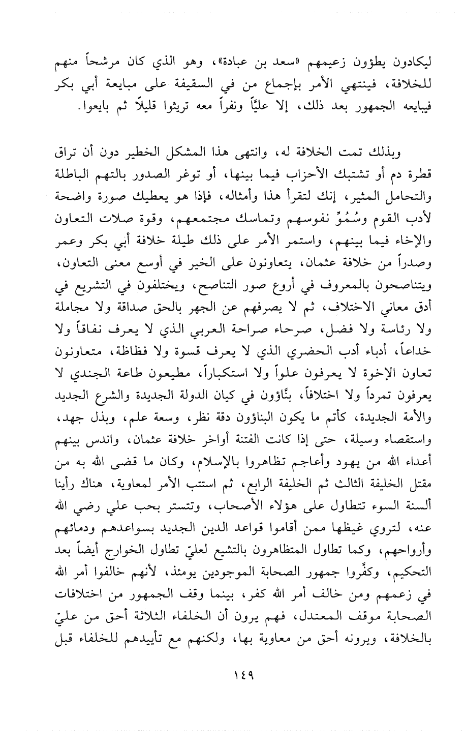 وبذلك تمت الخلافة له وانتهى هذا المشكل الخطير دُونَ أن تراق قطرة دم أو تشتبك الأحزاب فيما بينها، أو توغر الصدور بالتهم الباطلة والتحامل المثير، إنك لتقرأ هذا وأمثاله، فإذا هو يعطيك صورة واضحة لأدب القوم وَسُمَوِّ نفوسهم وتماسك مجتمعهم، وقوة صِلاَتِ التعاون والإخاء فيما بينهم، واستمر الأمر على ذلك طيلة خلافة أبي بكر وعمر وصدراً من خلافة عثمان، يتعاونون على الخير في أوسع معنى التعاون، ويتناصحون بالمعروف في أروع صور التناصح، ويختلفون في التشريع في أدق معاني الاختلاف، ثم لا يصرفهم عن الجهر بالحق صداقة ولا مجاملة ولا رئاسة ولا فضل، صرحاء صراحة العربي الذي لا يعرف نفاقاً ولا خداعاً، أدباء أدب الحضري الذي لا يعرف قسوة ولا فظاظة، متعاونون تعاون الإخوة لا يعرفون عُلُوًّا ولا استكباراً، مطيعون طاعة الجندي لا يعرفون تمرداً ولا اختلافاً، بَنَّاؤُونَ في كيان الدولة الجديدة والشرع الجديد وَالأُمَّةِ الجديدة، كَأَتَمِّ ما يكون البَنَّاؤُونَ دقة نظر، وسعة علم، وبذل جُهْدٍ، واستقصاء وسيلة، حتى إذا كانت الفتنة أواخر خلافة عثمان، واندس بينهم أعداء الله من يهود وأعاجم تظاهروا بالإسلام، وكان ما قضى اللهُ به من مقتل الخليفة الثالث ثم الخليفة الرابع، ثم استتب الأمر لمعاوية، هناك رأينا ألْسِنَةَ السُّوءِ تتطاول على هؤلاء الأصحاب، وَتَتَسَتَّرُ بِحُبِّ عَلِيٍّ - رَضِيَ اللهُ عَنْهُ -، لتروي غيظها مِمَّنْ أقاموا قواعد الدين الجديد بسواعدهم ودمائهم وأرواحهم، وكما تطاول المتظاهرون بِالتَشَيُّعِ لِعَلِيٍّ تطاول الخوارج أيضاًً بعد التحكيم، وكَفَّرُوا جمهور الصحابة الموجودين يومئذ، لأنهم خالفوا أمر الله في زعمهم ومن خالف أمر الله كفر، بينما وقف الجمهور من اختلافات الصحابة موقف المعتدل، فهم يرون أن الخلفاء الثلاثة أحق من عَلِيٍّ بالخلافة، ويرونه أحق من معاوية بها، ولكنهم مع تأييدهم للخلفاء قبل