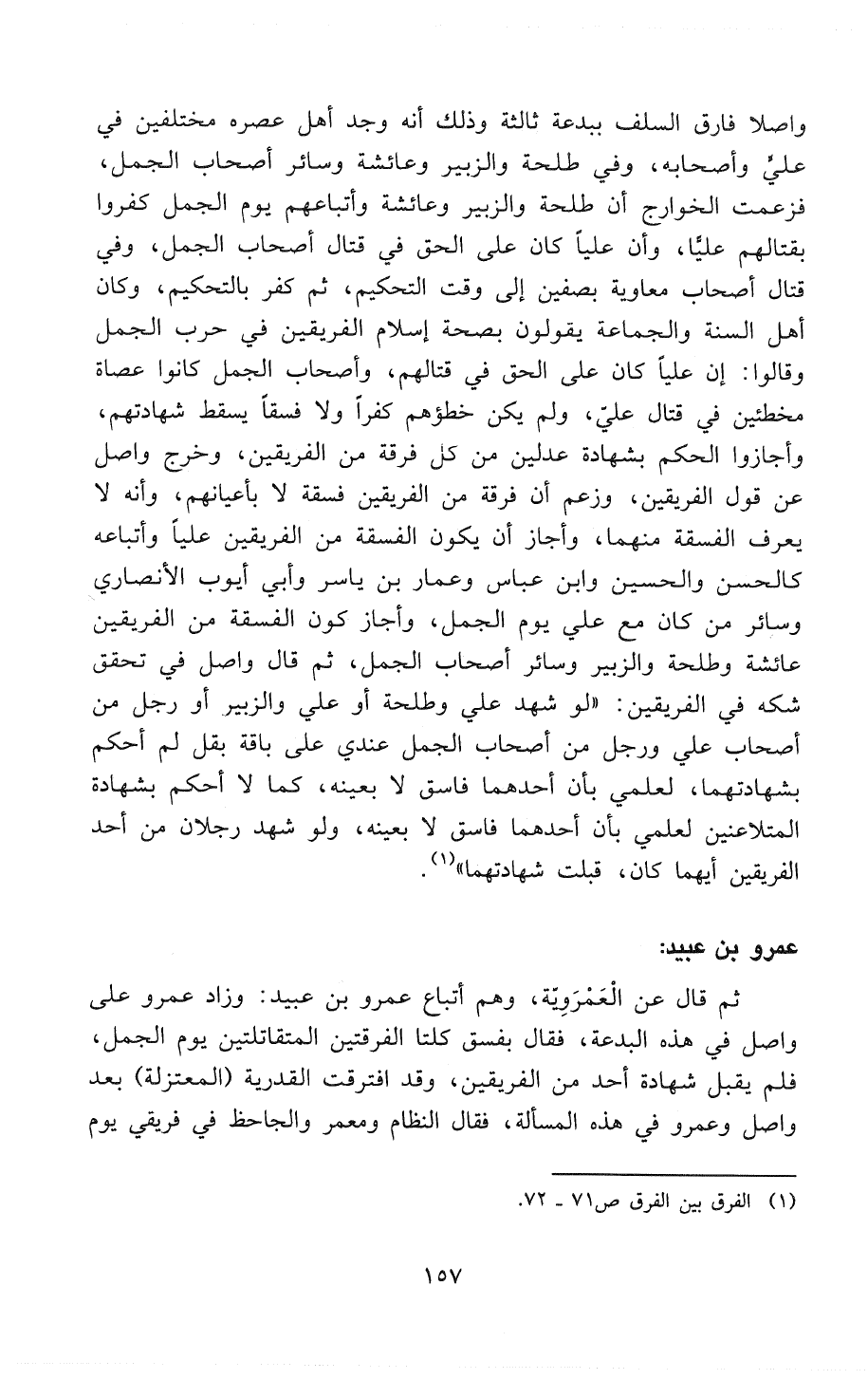 ثم قال عن العَمْرَوِيَّةِ، هم أتباع عمرو بن عبيد: «وَزَادَ عَمْرُو عَلَى وَاصَلَ فِي هَذِهِ البِدْعَةِ، فَقَالَ بِفِسْقٍ كِلْتَا الفِرْقَتَيْنِ المُتَقَاتِلَتَيْنِ يَوْمَ الجَمَلِ، فَلَمْ يَقْبَلْ شَهَادَةَ أَحَدٍ مِنَ الفَرِيقَيْنِ، وَقَدْ افْتَرَقَتْ القَدَرِيَّةُ (المُعْتَزِلَةُ) بَعْدَ وَاصِلَ وَعَمْرَو فِي هَذِهِ الْمَسْأَلَةِ، فَقَالَ النَظَّامُ وَمَعْمَرٌ وَالجَاحِظُ فِي فَرِيقَيْ يَوْمَ