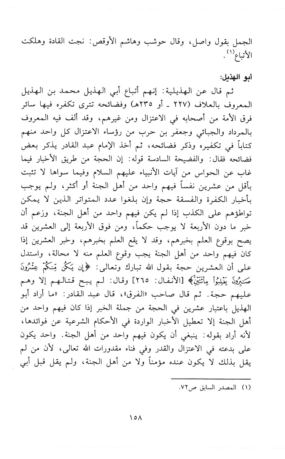 فِي الاعْتِزَالِ وَمِنْ غَيْرِهِمْ، وَقَدْ أَلَّفَ فِيهِ المَعْرُوفُ بِالمِرْدَادِ وَالجُبَّائِيُّ وَجَعْفَرُ بْنُ حَرْبٍ مِنْ رُؤَسَاءِ الاعْتِزَالِ كُلَّ وَاحِدٍ مِنْهُمْ كِتَابًا فِيْ تَكْفِيرِهِ وَذَكَرَ فَضَائِحَهُ»، ثم أخذ الإمام عبد القادر يذكر بعض فضائحه فقال: «وَالفَضِيحَةُ السَّادِسَةِ قَوْلُهُ: إِنَّ الحُجَّةَ مِنْ طَرِيقِ الأَخْبَارِ فَمَا غَابَ عَنْ الحَوَاسِّ مِنْ آيَاتِ الأَنْبِيَاءِ - عَلَيْهِمْ السَّلاَمُ - وَفِيمَا سِوَاهَا لاَ تَثْبُتُ بِأَقَلَّ مِنْ عِشْرِينَ نَفْسًا فِيهِمْ وَاحِدٌ مِنْ أَهْلِ الجَنَّةِ أَوْ أَكْثَرَ، وَلَمْ يُوْجِبْ بِأَخْبَارِ الكَفَرَةِ وَالفَسَقَةِ حُجَّةً وَإِنْ بَلَغُوا عَدَدَ التَّوَاتُرِ الذِينَ لاَ يُمْكِنُ تَوَاطُؤُهُمْ عَلَى الكَذِبِ إِذَا لَمْ يَكُنْ فِيهِمْ وَاحِدٌ مِنْ أَهْلِ الجَنَّةِ، وَزَعَمَ أَنَّ خَبَرَ مَا دُونَ الأََرْبَعَةِ لاَ يُوجِبُ حُكْمًا، وَمِنْ فَوْقِ الأَرْبَعَةِ إِلَى العِشْرِينَ قَدْ يَصِحُّ بِوُقُوعِ العِلْمِ بِخَبَرِهِمْ، وَقَدْ لاَ يَقَعُ بِخَبَرِهِمْ، وَخَبَرُ العِشْرِينَ إِذَا كَانَ فِيهِمْ وَاحِدٌ مِنْ أَهْلِ الجَنَّةِ يَجِبُ وُقُوعُ العِلْمِ مِنْهُ لاَ مَحَالَةَ، وَاسْتَدَلَّ عَلَى أَنَّ العِشْرِينَ حُجَّةٌ بِقَوْلِ اللهِ تَبَارَكَ وَتَعَالَى: {إِنْ يَكُنْ مِنْكُمْ عِشْرُونَ صَابِرُونَ يَغْلِبُوا مِائَتَيْنِ} (¬2). وقال: «لَمْ يُبِحْ قِتَالَهُمْ إِلاَّ وَهُمْ عَلَيْهِمْ حُجَّةٌ». ثم قال صاحب " الفرق "، قال عبد القادر: «مَا أَرَادَ أَبُو الهُذَيْلِ بِاعْتِبَارِ عِشْرِينَ فِيْ الحُجَّةِ مِنْ جُمْلَةِ الخَبَرَ إِذَا كَانَ فِيهِمْ وَاحِدٌ مِنْ أَهْلِ الجَنَّةِ إِلاَّ تَعْطِيلَ الأَخْبَارِ الوَارِدَةِ فِي الأَحْكَامِ الشَّرْعِيَّةِ عَنْ فَوَائِدِهَا، لأَنَّهُ أَرَادَ بِقَوْلِهِ: يَنْبَغِي أَنْ يَكُونَ فِيهِمْ وَاحِدٌ مِنْ أَهْلِ الجَنَّةِ. وَاحِدٌ يَكُونُ عَلَىَ بِدْعَتِهِ فِي الاعْتِزَالِ وَالقَدَرِ وَفِي فِنَاءِ مَقْدُورَاتِ اللهِ تَعَالَى، لأَنَّ مَنْ لَمْ يَقُلْ بِذَلِكَ لاَ يَكُونُ عِنْدَهُ مُؤْمِنًا وَلاَ مِنْ أَهْلِ الجَنَّةِ، وَلَمْ يَقُلْ قَبْلَ أَبِي