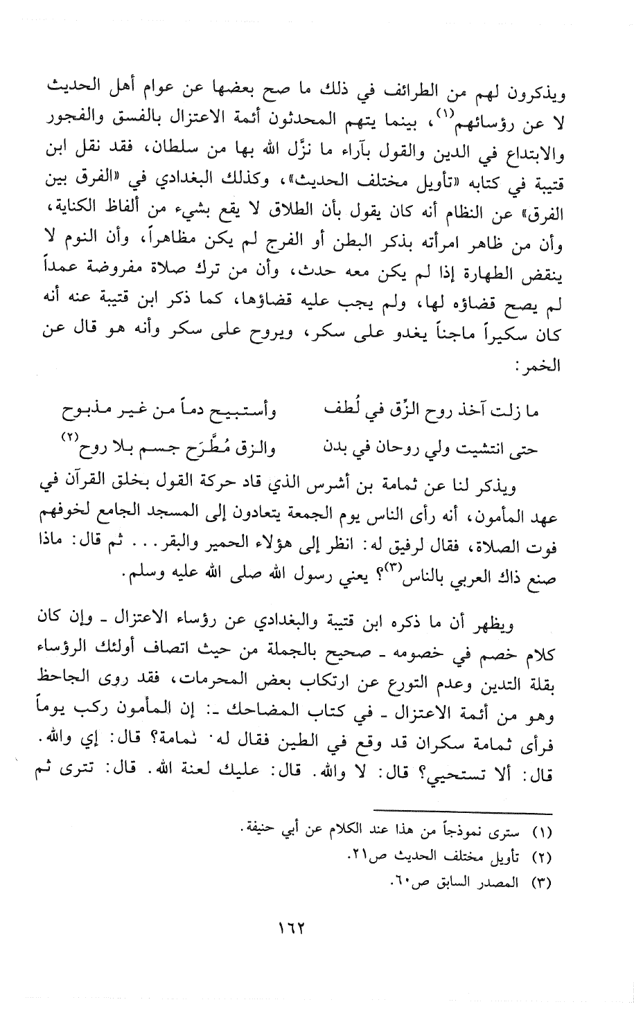 ويظهر أن ما ذكره ابن قتيبة والبغدادي عن رؤساء الاعتزال - وإن كان كلام خصم في خصومه - صحيح بالجملة من حيث اتصاف أولئك الرؤساء بِقِلَّةِ التَدَيُّنِ وعدم التورع عن ارتكاب بعض المُحَرَّمَاتِ، فقد روى الجاحظ وهو من أئمة الاعتزال - في " كتاب المضاحك ": إِنَّ المَأْمُونَ رَكِبَ يَوْمًا فَرَأَىَ ثُمَامَةَ سَكْرَانَ قَدْ وَقَعَ فِي الطِّينِ فَقَالَ لَهُ: «ثُمَامَةُ؟» قَالَ: «أَيْ واللهِ». قَالَ: «أَلاَ تَسْتَحْيِ؟» قَالَ: «لاَ وَاللهِ». قَالَ: «عَلَيْكَ لَعْنَةُ اللهِ. قَالَ: «تَتْرَى ثُمَّ