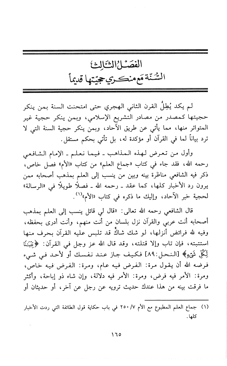 وأول من تعرض لهذه المذاهب - فيما نعلم - الإمام الشافعي - رَحِمَهُ اللهُ -، فقد جاء في كتاب "جماع العلم " من كتاب " الأُم " فصل خاص، ذكر فيه الشافعي مناظرة بينه وبين من يُنْسَبُ إلى العلم بمذهب أصحابه مِمَّنْ يرون رَدَّ الأخبار كلها، كما عقد - رَحِمَهُ اللهُ - فصلاً طويلاً في " الرسالة " لحُجِيَّةِ خَبَرِ الآحَادِ، وإليك ما ذكره في كتاب " الأم " (¬1).
