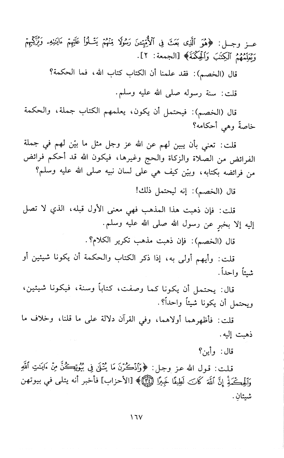 قَالَ (الخَصْمُ): قَالَ: «أَفَيَحْتَمِلُ أَنْ يَكُونَ، يُعَلِّمُهُمْ الْكِتَابَ جُمْلَةً، وَالْحِكْمَةَ خَاصَّةً وَهِيَ أَحْكَامُهُ؟»
