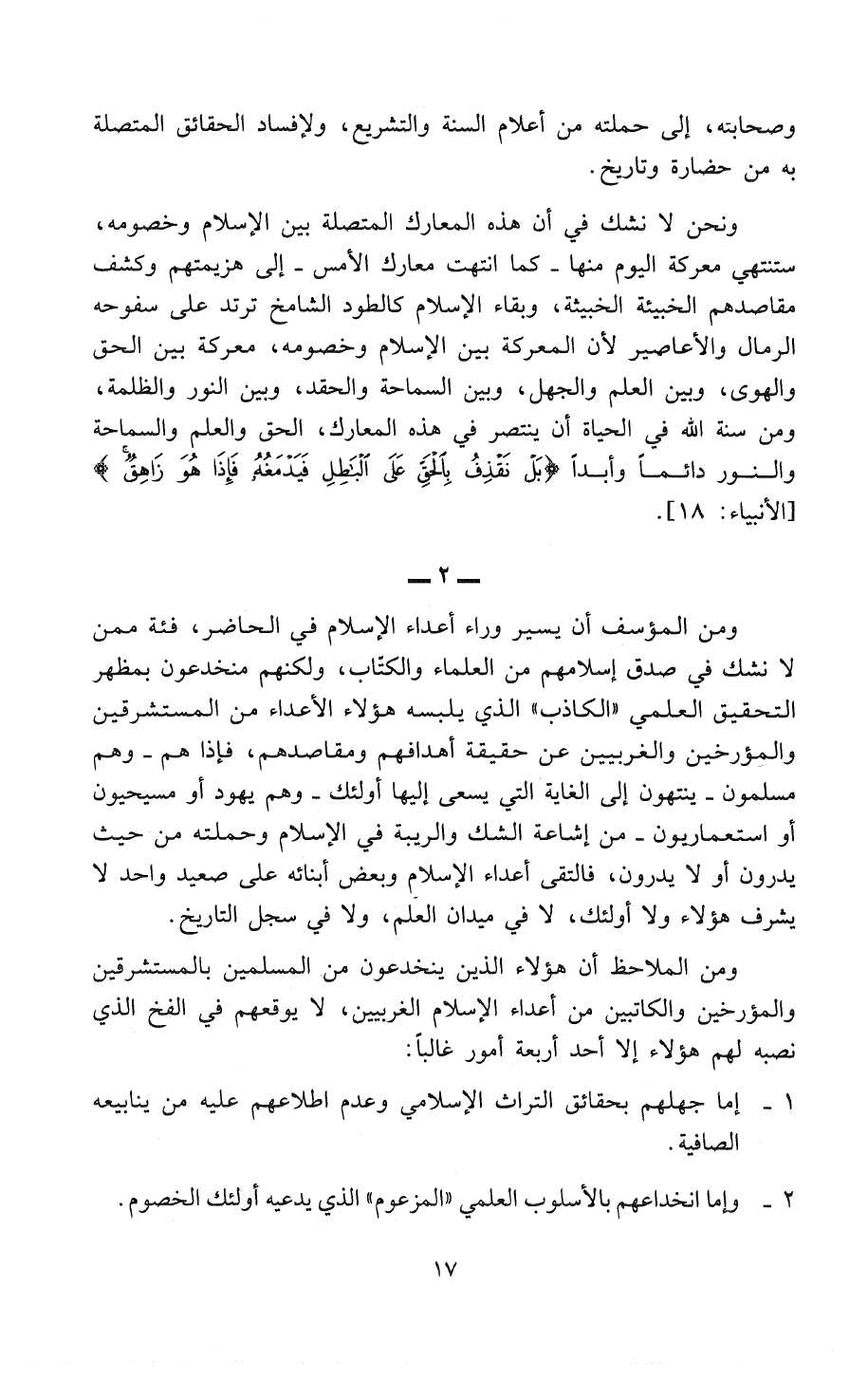 ومن المؤسف أن يسير وراء أعداء الإسلام في الحاضر، فئة مِمَّنْ لا نشك في صدق إسلامهم من العُلَمَاءِ وَالكُتَّابِ، ولكنهم منخدعون بمظهر التحقيق العلمي «الكاذب» الذي يلبسه هؤلاء الأعداء من المُسْتَشْرِقِينَ والمُؤَرِّخِينَ وَالغَرْبِيِّينَ عن حقيقة أهدافهم ومقاصدهم، فإذا هم - وهم مسلمون - ينتهون إلى الغاية التي يسعى إليها أولئك - وَهُمْ يَهُودٌ أَوْ مَسِيحِيُّونَ أَوْ اسْتِعْمَارِيُّونَ - من إشاعة الشك والريبة في الإسلام وَحَمَلَتِهِ من حيث يدرون أو لا يدرون، فالتقى أعداء الإسلام وبعض أبنائه على صعيد واحد لا يُشَرِّفُ هؤلاء ولا أولئك، لا في ميدان العلم، ولا في سِجِلِّ التاريخ.