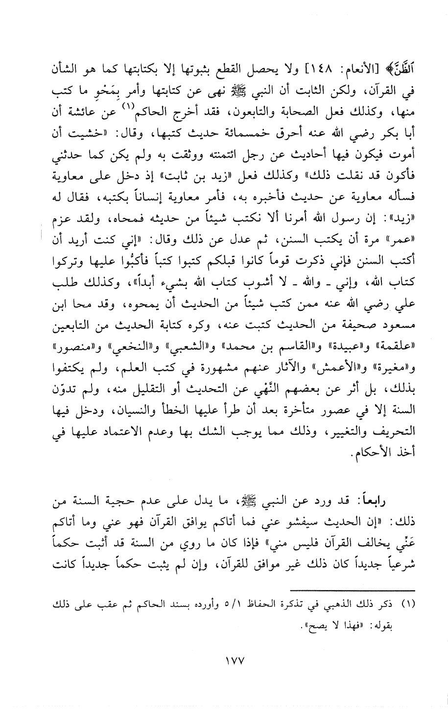 الظَّنَّ} (¬1) ولا يحصل القطع بثبوتها إلا بكتابتها كما هو الشأن في القرآن، ولكن الثابت أَنَّ النَّبِيَّ - صَلََّى اللهُ عَلَيْهِ وَسَلَّمَ - نهى عن كتابتها وأمر بِمَحْوِ ما كتب منها، وكذلك فعل الصحابة والتابعون، فقد أخرج الحاكم (¬2) عَنْ عَائِشَةَ أَنَّ أَبَا بَكْرٍ - رَضِيَ اللهُ عَنْهُ - أَحْرَقَ خَمْسَمِائَةِ حَدِيثٍ كَتَبَهَا، وَقَالَ: «خَشِيتُ أَنْ أَمُوتَ فَيَكُونُ فِيهَا أَحَادِيثَ عَنْ رَجُلٍ أَئْتَمَنْتُهُ وَوَثِقْتُ بِهِ وَلَمْ يَكُنْ كَمَا حَدَّثَنِي فَأَكُونَ قَدْ نَقَلْتُ ذَلِكَ» وكذلك فعل «زيد بن ثابت» إذ دخل على معاوية فسأله معاوية عن حديث فأخبره به، فأمر معاوية إنسانا بكتبه، فقال له «زيد»: إن رسول الله أمرنا ألاَّ نكتب شيئأ من حديثه فمحاه، ولقد عزم «عمر» مَرَّةً أن يكتب السنن، ثم عدل عن ذلك وقال: «إِنِّي كُنْتُ أُرِيدُ أَنْ أَكْتُبَ السُّنَنَ، وَإِنِّي ذَكَرْتُ قَوْمًا كَانُوا قَبْلَكُمْ كَتَبُوا كُتُبًا فَأَكَبُّوا عَلَيْهَا وَتَرَكُوا كِتَابَ اللهِ، وَإِنِّي - وَاللهِ - لاَ أَشُوبُ كِتَابَ اللهِ بِشَيْءٍ أَبَدًا»، وكذلك طلب عَلِيٌّ - رَضِيَ اللهُ عَنْهُ - مِمَّنْ كتب شيئاً من الحديث أن يمحوه، وقد محا ابن مسعود صحيفة من الحديث كتبت عنه، وكره كتابة الحديث من التَّابِعِينَ «علقمة» و «عبيدة» و «القاسم بن محمد» و «الشعبي» و «النخعي» و «منصور» و «مغيرة» و «الأعمش» والآثار عنهم مشهورة في كتب العلم، ولم يكتفوا بذلك، بل أثر عن بعضهم النَّهْيَ عن التحديث أو التقليل منه، ولم تُدَوَّنْ السُنَّةُ إلا في عصور متأخرة بعد أن طرأ عليها الخطأ والنسيان، ودخل فيها التحريف والتغيير، وذلك مِمَّا يوجب الشك بها وعدم الاعتماد عليها في أخذ الأحكام.