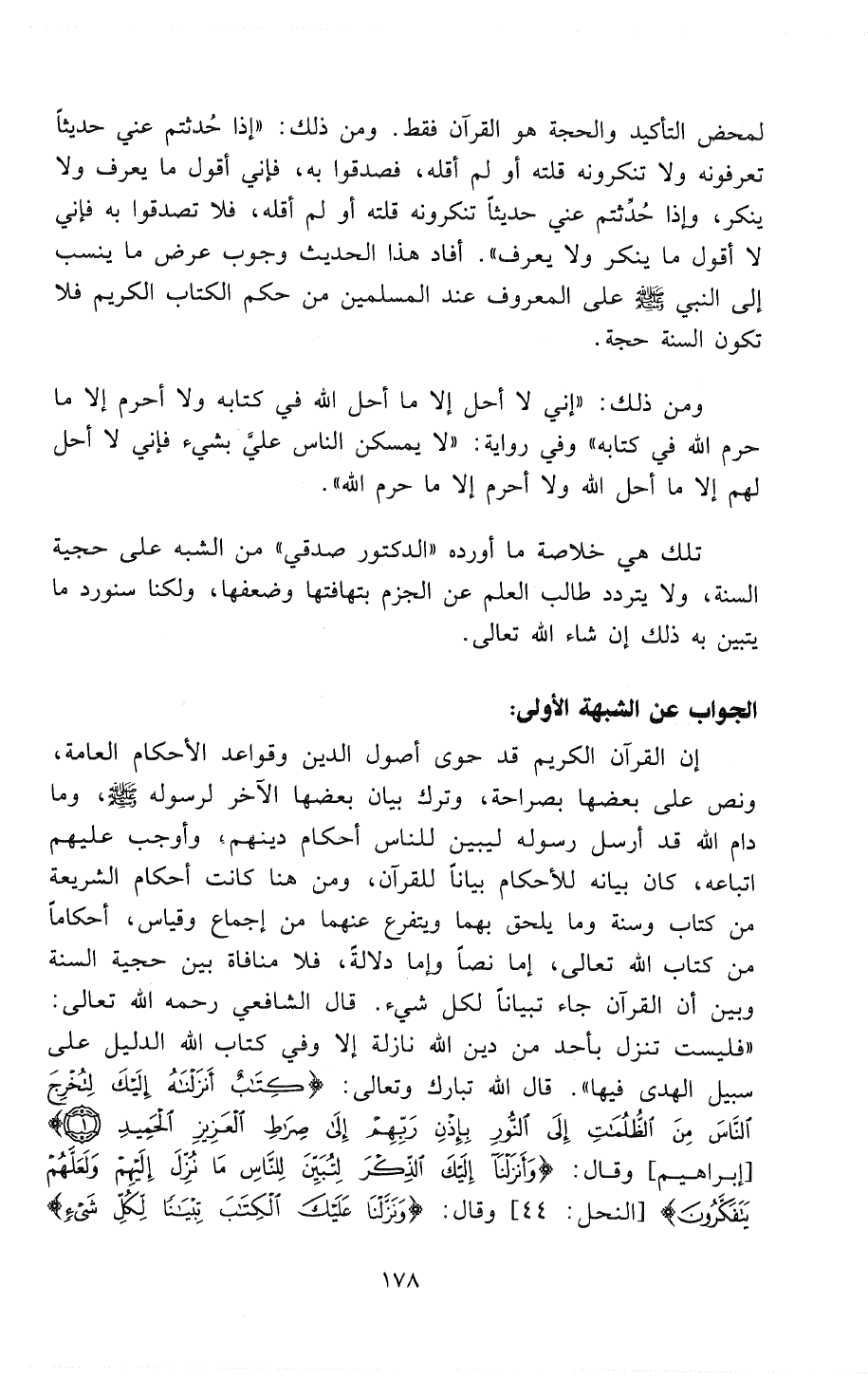 ومن ذلك: «إِنِّي لاَ أُحِلُّ إِلاَّ مَا أَحَلَّ اللَّهُ فِي كِتَابِهِ، وَلاَ أُحَرِّمُ إِلاَّ مَا حَرَّمَ اللَّهُ فِي كِتَابِهِ» وفي رواية «لاَ يُمْسِكَنَّ النَّاسُ عَلَىَّ بِشَىْءٍ (*)، فَإِنِّي لاَ أُحِلُّ لَهُمْ إِلاَّ مَا أَحَلَّ اللَّهُ وَلاَ أُحَرِّمُ إِلاَّ مَا حَرَّمَ اللَّهُ». تلك هي خلاصة ما أورده «الدكتور صدقي»، من الشُبَهِ على حُجِّيَّةِ السُنَّةِ، ولا يتردد طالب العلم عن الجزم بتهافتها وضعفها، ولكنا سنورد ما يتبين به ذلك إن شاء الله تعالى.