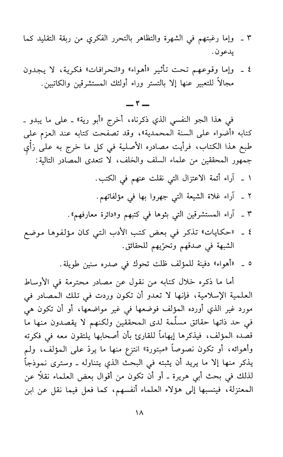 أما ما ذكره خلال كتابه من نقول عن مصادر محترمة في الأوساط العلمية الإسلامية، فإنها لا تعدو أن تكون وردت في تلك المصادر في مورد غير الذي أورده المؤلف فوضعها في غير مواضعها، أو أن تكون هي في حد ذاتها حقائق مُسَلَّمَةٍ لدى المُحَقِّقِينَ ولكنهم لا يقصدون منها ما قصده المؤلف، فيذكرها إِيهَامًا للقارئ بأن أصحابها يلتقون معه في فكرته وأهوائه، أو تكون نصوصا «مبتورة» انتزع منها ما يَرُدُّ على المؤلف، ولم يذكر منها إلا ما يريد أن يثبته في البحث الذي يتناوله - وسنرى نموذجا لذلك في بحث أبي هريرة - أو أن تكون من أقوال بعض العلماء نقلاً عن المعتزلة، فينسبها إلى هؤلاء العلماء أنفسهم، كما فعل فيما نقل عن ابن