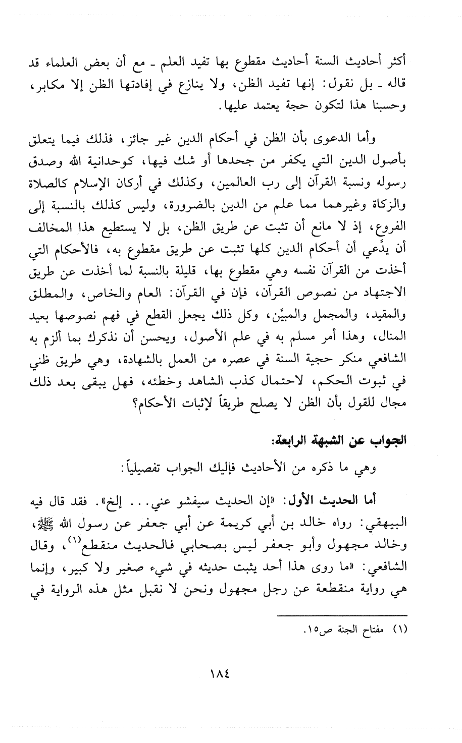 وأما الدعوى بأن الظن في أحكام الدين غير جائز، فذلك فيما يتعلق بأصول الدين التي يكفر من جحدها أو شك فيها، كوحدانية الله وصدق رسوله ونسبة القرآن إلى رب العالمين، وكذلك في أركان الإسلام كالصلاة والزكاة وغيرهما مِمَّا علم من الدين بالضرورة، وليس كذلك بالنسبة إلى الفروع، إذ لا مانع أن تثبت عن طريق الظن، بل لا يستطيع هذا المخالف أن يَدَّعِي أنَّ أحكام الدين كلها تثبت عن طريق مقطوع به، فالأحكام التي أخذت من القرآن نفسه وهي مقطوع بها، قليلة بالنسبة لما أخدْت عن طريق الاجتهاد من نصوص القرآن، فإن في القرآن: العَامُّ وَالخَاصُّ، وَالمُطْلَقُ وَالمُقَيَّدُ، وَالمُجْمَلُ وَالمُبَيَّنُ، وكل ذلك يجعل القطع في فهم نصوصها بعيد المنال، وهذا أمر مُسَلَّمٌ به في علم الأصول، ويحسن أن نذكرك بما ألزم به الشافعي مُنكِرَ حُجِيَّةَ السُنَّةِ في عصره من العمل بالشهادة، وهي طريق ظَنِّيٌّ في ثبوت الحكم، لاحتمال كذب الشاهد: وخطئه، فهل يبقى بعد ذلك مجال للقول بِأنَّ الظَنَّ لا يصلح طريقاً لإثبات الأحكام؟