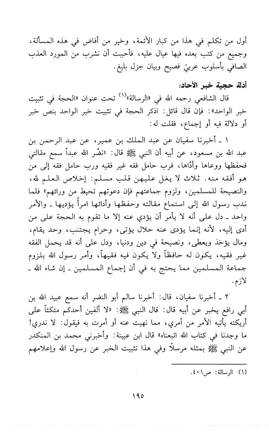 1 - أخبرنا سفيان عن عبد الملك بن عمير، عن عبد الرحمن بن عبد الله بن مسعود، عن أبيه أنَّ النَّبِيّ- صَلََّى اللهُ عَلَيْهِ وَسَلَّمَ - قال: «نَضَّرَ اللَّهُ عَبْدًا سَمِعَ مَقَالَتِي فَحَفِظَهَا وَوَعَاهَا وَأَدَّاهَا، فَرُبَّ حَامِلِ فِقْهٍ غَيْرِ فَقِيهٍ، وَرُبَّ حَامِلِ فِقْهٍ إِلَى مَنْ هُوَ أَفْقَهُ مِنْهُ. ثَلاَثٌ لاَ يُغِلُّ عَلَيْهِنَّ قَلْبُ مُسْلِمٍ: إِخْلَاصُ الْعَمَلِ لِلَّهِ، وَالنَّصِيحَةُ لِلْمُسْلِمِينَ، وَلُزُومُ جَمَاعَتِهِمْ، فَإِنَّ دَعْوَتَهُمْ تُحِيطُ مِنْ وَرَائِهِمْ» فلما ندب رسول الله إلى استماع مقالته وحفظها وأدائها امرءاًْ يؤديها - والأمر واحد - دَلَّ على أنه لا يؤمر أن يؤدى عنه إلا ما تقوم به الحُجَّةُ على من أدى إليه، لأنه إنما يؤدى عنه حلال يؤتى، وحرام يجتنب، وَحَدٌّ يُقَامُ، ومال يؤخذ ويعطى، ونصيحة في دين ودنيا، وَدَلَّ على أنه قد يحمل الفقه غير فقيه، يكون له حافظاً ولا يكون فيه فقيهاً، وأمر رسول الله بلزوم جماعة المُسْلِمِينَ مِمَّا يحتج به في أن إجماع المُسْلِمِينَ - إنْ شاء الله - لازم.