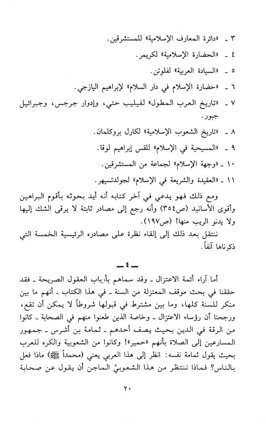 أما آراء أئمة الاعتزال - وقد سماهم بأرباب العقول الصريحة - فقد حققنا في بحث موقف المعتزلة مِنَ السُنَّةِ - في هذا الكتاب - أنهم ما بين مُنْكِرٍ لِلْسُنَّةِ كلها، وما بين مشترط في قبولها شروطاً لا يمكن أن تقع، وَرَجَّحْنَا أن رؤساء الاعتزال - وخاصة الذين طعنوا منهم في الصحابة - كانوا من الرقة في الدين بحيث يصف أحدهم - ثمامة بن أشرس - جمهور المسارعين إلى الصلاة بأنهم «حَمِيرٌ»! وكانوا من الشعوبية وَالكُرْهِ للعرب بحيث يقول ثمامة نفسه: «انْظُرْ إِلَى هَذَا العَرَبِيِّ، يَعْنِي (مُحَمَّدًا - صَلََّى اللهُ عَلَيْهِ وَسَلَّمَ -) مَاذَا فَعَلَ بِالنَّاسِ؟» (¬1) فماذا ننتظر من هذا الشعوبي الماجن أن يقول عن صحابة