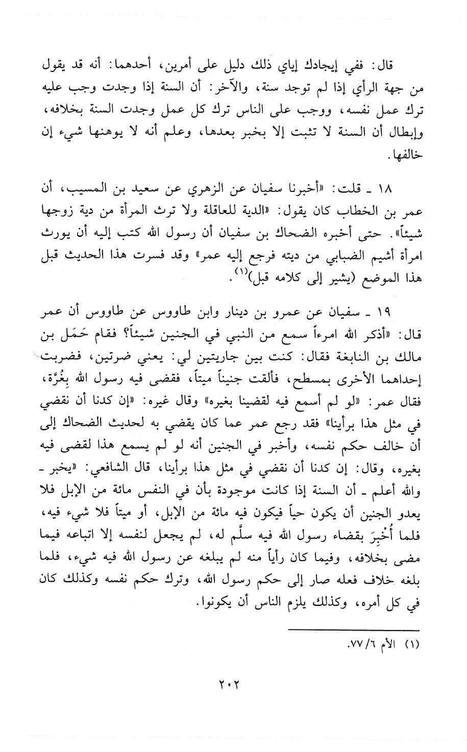 19 - سفيان عن عمرو بن دينار وابن طاووس عن طاووس أن عمر قال: «أُذَكِّرُ اللَّهَ امْرَءًا سَمِعَ مِنَ النَّبِيِّ صَلَّى اللهُ عَلَيْهِ وَسَلَّمَ فِي الجَنِينِ شَيْئًا؟، فَقَامَ حَمَلُ بْنُ مَالِكِ بْنِ النَّابِغَةِ فَقَالَ: " كُنْتُ بَيْنَ جَارَتَيْنِ لِي - يَعْنِي ضَرَّتَيْنِ -، فَضَرَبَتْ إِحْدَاهُمَا الأُخْرَى بِمِسْطَحٍ، فَأَلْقَتْ جَنِينًا مَيِّتًا، فَقَضَى فِيهِ رَسُولُ اللَّهِ صَلَّى اللهُ عَلَيْهِ وَسَلَّمَ بِغُرَّةٍ "، فَقَالَ عُمَرُ: " لَوْ لَمْ [نَسْمَعْ] هَذَا لَقَضَيْنَا فِيهِ بِغَيْرِ [هَذَا] " (*)». وقال غيره: «إِنْ كِدْنَا أَنْ نَقْضِي فِي مِثْلِ هَذَا بِرَأْيِنَا» فقد رجع عمر عما كان يقضي به لحديث الضحاك إلى أن خالف حكم نفسه، وأخبر في الجنين أنه لو لم يسمع هذا لقضى فيه بغيره، وقال: «إِنْ كِدْنَا أَنْ نَقْضِي فِي مِثْلِ هَذَا بِرَأْيِنَا» قال الشافعي: «يخبر - والله أعلم - أن السُنَّة إذا كانت موجودة بأن في النفس مائة من الإبل فلا يعدو الجنين أن يكون حَيًّا فيكون فيه مائة من الإبل، أو ميتاً فلا شيء فيه، فلما أُخْبِرَ بقضاء رسول الله فيه سَلَّمَ له، لم يجعل لنفسه إلا اتباعه فيما مضى بخلافه، وفيما كان رأياً منه لم يبلغه عن رسول الله فيه شيء، فلما بلغه خلاف فعله صار إلى حكم رسول الله، وترك حكم نفسه وكذلك كان في كل أمره، وكذلك يلزم الناس أن يكونوا.