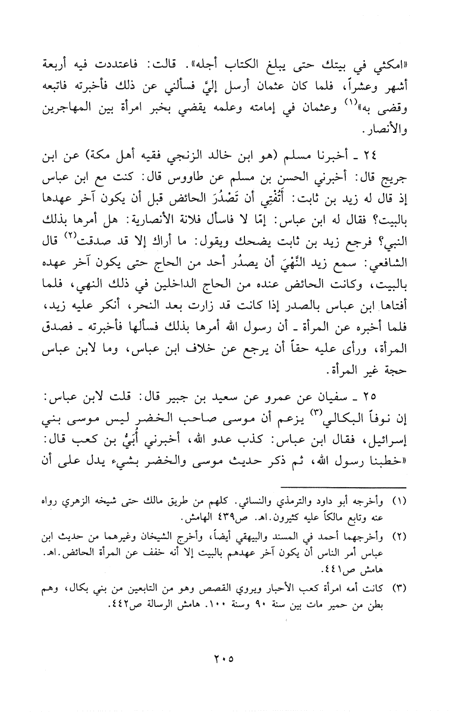 24 - أخبرنا مسلم (هو ابن خالد الزنجي فقيه أهل مكة) عَنْ ابْنِ جُرَيْجٍ قَالَ: أَخْبَرَنِي الحَسَنُ بْن مُسْلِم عَنْ طَاوُوسَ قَالَ: «كُنْت مَعَ اِبْن عَبَّاس إِذْ قَالَ لَهُ زَيْد بْن ثَابِت: " تُفْتِي أَنْ تُصْدِر الْحَائِض قَبْل أَنْ يَكُون آخِر عَهْدهَا بِالْبَيْتِ؟ " فَقَالَ اِبْن عَبَّاس: " أَمَّا لاَ [فَسَلْ] فُلاَنَة الأَنْصَارِيَّة: هَلْ أَمَرَهَا النَّبِيُّ صَلَّى اللهُ عَلَيْهِ وَسَلَّمَ؟ " قَالَ: فَرَجَعَ زَيْدُ بْنُ ثَابِتٍ يَضْحَكُ وَيَقُولُ: " مَا أَرَاك إِلاَّ قَدْ صَدَقْت " (¬2).
