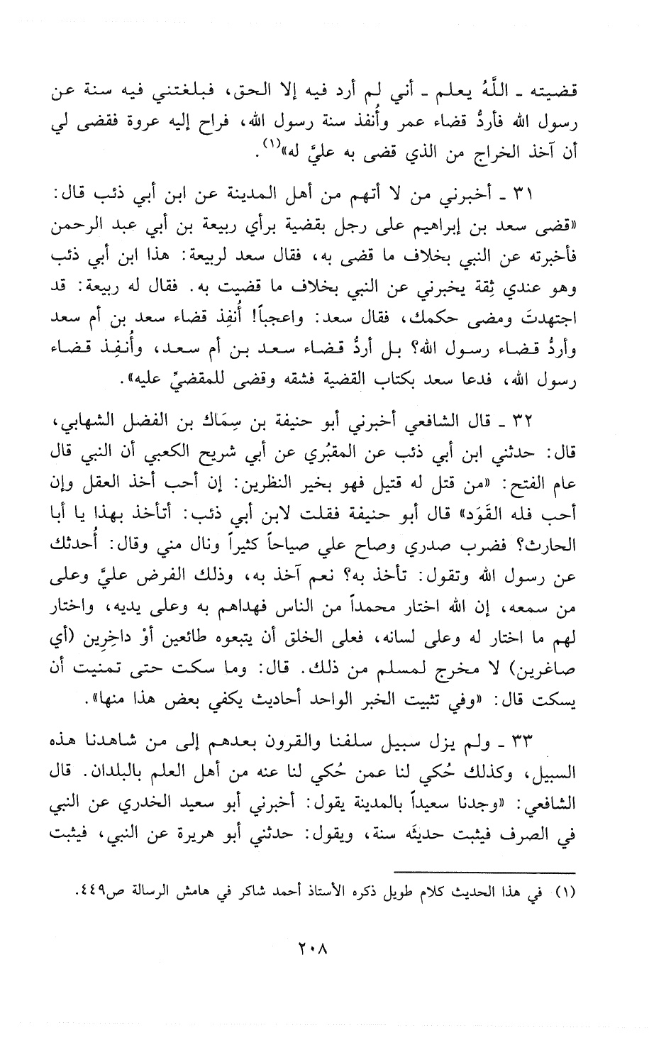 33 - ولم يزل سبيل سلفنا والقرون بعدهم إلى من شاهدنا هذه السبيل، وكذلك حُكِيَ لنا عمن حُكِيَ لنا عنه من أهل العلم بالبلدان. قال الشافعي: «وجدنا سعيداً بالمدينة يقول: أخبرني أبو سعيد الخُدري عَنْ النَّبِيِّ في الصرف فيثبت حديثَه سُنَّةً، ويقول: حدثني أبو هريرة عَنْ النَّبِيِّ، فيثبت
