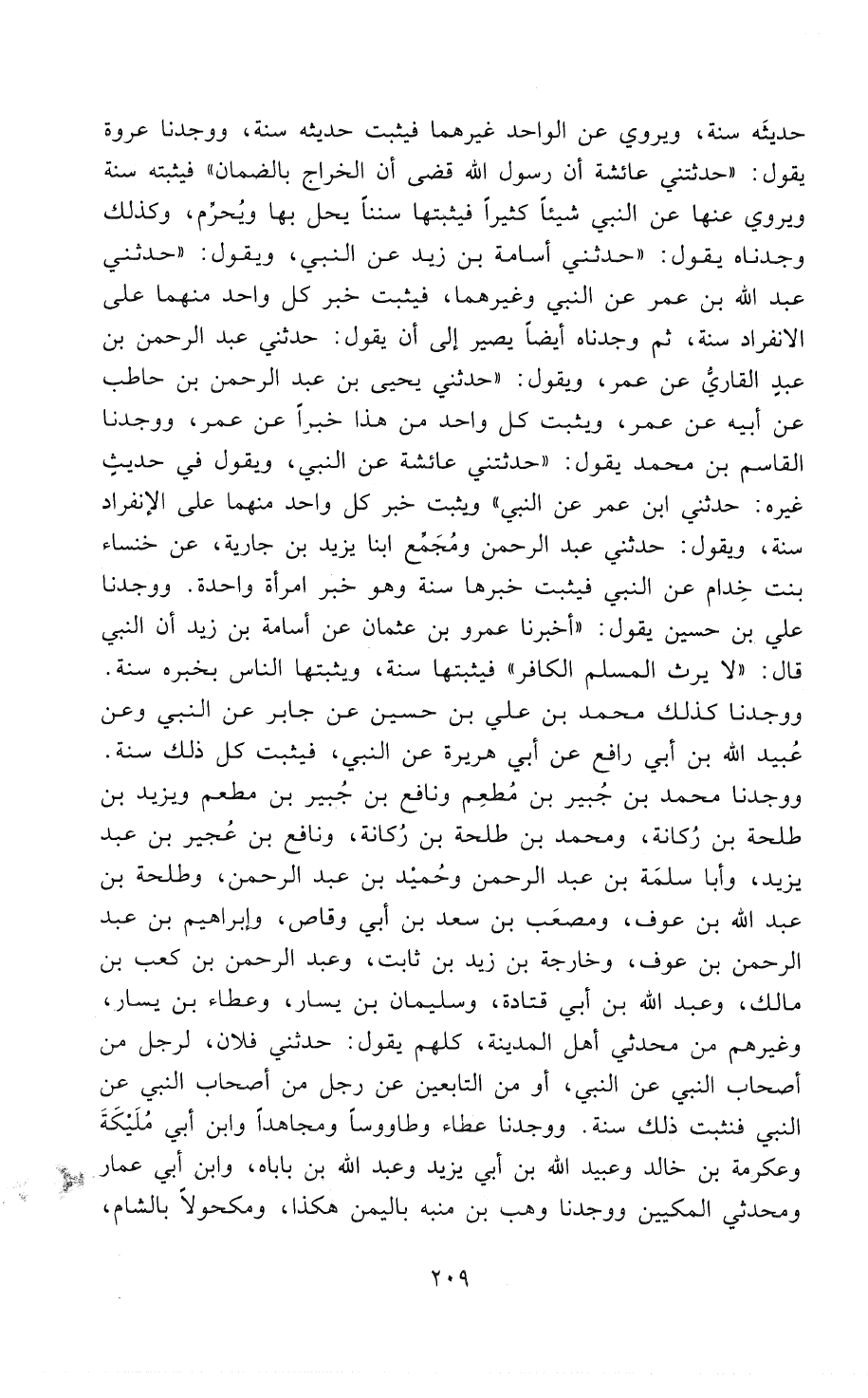 ووجدنا علي بن حُسين يقول: «أخبرنا عمرو بن عثمان عن أسامة بن زيد أنَّ النَّبِيّ قال: «لاَ يَرِثُ الْمُسْلِمُ الْكَافِرَ» فيثبتها سُنَّةً، ويثبتها الناس بخبره سُنَّةً. ووجدنا كذلك محمد بن علي بن حُسين عن جابر عَنْ النَّبِيِّ وعن عُبيد الله بن أبي رافع عن أبي هريرة عَنْ النَّبِيِّ، فيثبت كل ذلك سُنَّة. ووجدنا محمد بن جُبير بن مُطعِم ونافع بن جُبير بن مطعم ويزيد بن طلحة بن رُكانة، ومحمد بن طلحة بن رُكانة، ونافع بن عُجير بن عبد يزيد، وأبا سلَمة بن عبد الرحمن وحُمْيد بن عبد الرحمن، وطلحة بن عبد الله بن عوف، ومُصعَبْ بن سعد بن أبي وقاص، وإبراهيم بن عبد الرحمن بن عوف، وخارجة بن زيد بن ثابت، وعبد الرحمن بن كعب بن مالك، وعبد الله بن أبي قتادة، وسليمان بن يسار، وعطاء بن يسار، وغيرهم من مُحَدِّثِي أهل المدينة، كلهم يقول: حَدَّثَنِي فلان، لرجل من أصحاب النَّبِيّ عَنْ النَّبِيِّ، أو من التَّابِعِينَ عن رجل من أصحاب النَّبِيّ عَنْ النَّبِيِّ فنثبت ذلك سُنَّةً. ووجدنا عطاء وَطَاوُوساً ومجاهداً وابن أبي مُليكة وعكرمة بن خالد وعبيد الله بن أبي يزيد وعبد الله بن باباه، وابن أبي عمار وَمُحَدِّثِي المَكِيِّينَ، ووجدنا وهب بن منبه باليمن هكذا، ومكحولاً بالشام