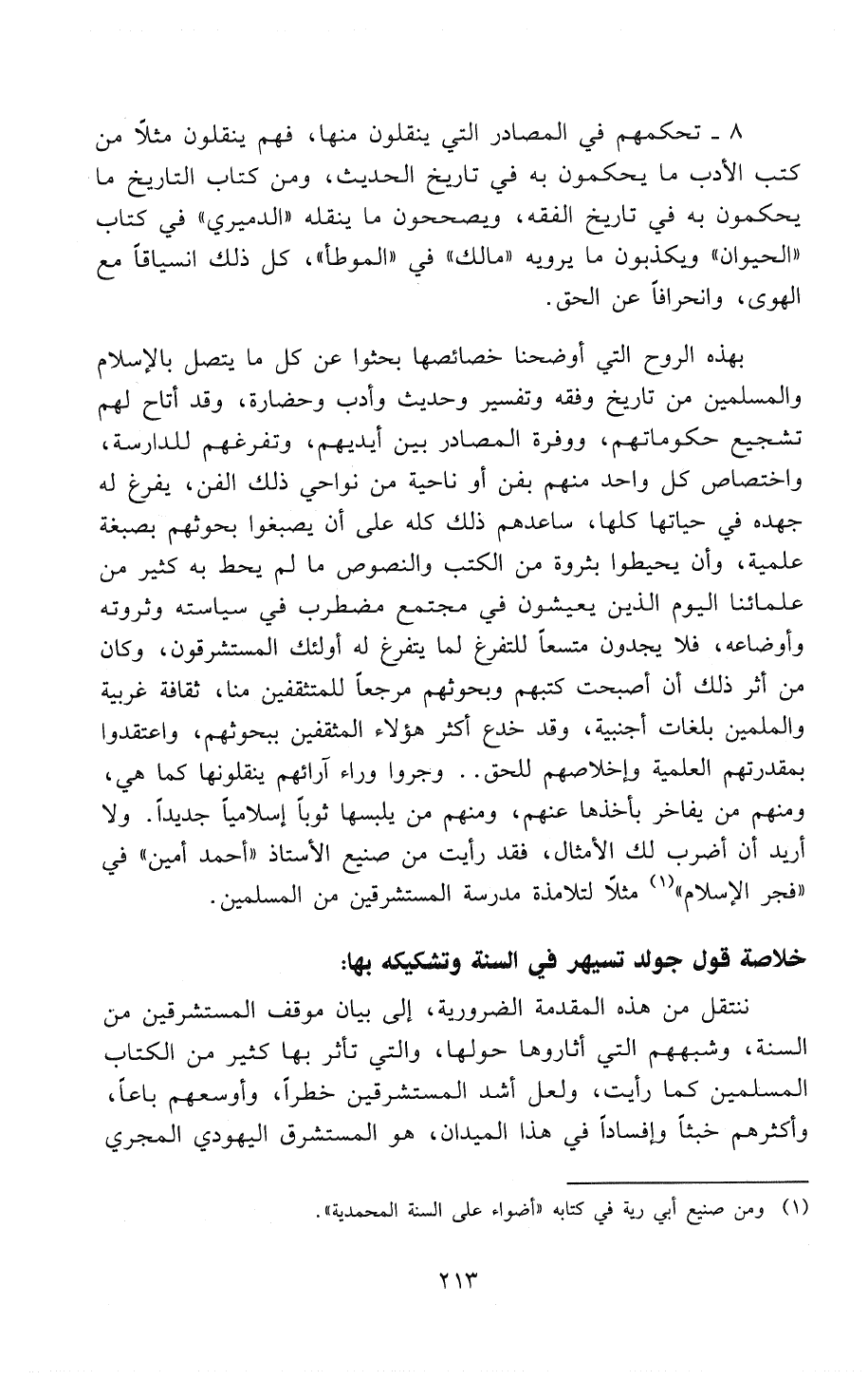 8 - تحكمهم في المصادر التي ينقلون منها، فهم ينقلون مثلاً من كتب الأدب ما يحكمون به في تاريخ الحديث، ومن كتاب التاريخ ما يحكمون به في تاريخ الفقه، وَيُصَحِّحُونَ ما ينقله «الدميري» في كتاب " الحيوان " (*) وَيُكَذِّبُونَ ما يرويه «مالك» في " الموطأ " كل ذلك انسياقاً مع الهوى، وانحرافاً عن الحق.