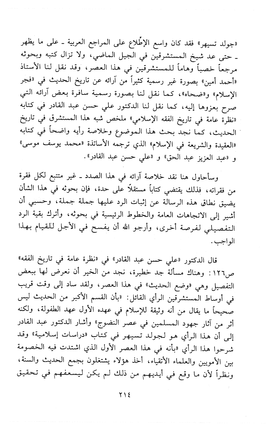 قال الدكتور «علي حسن عبد القادر» في " نظرة عامة في تاريخ الفقه " ص 126: وهناك مسألة جد خطيرة، نجد من الخير أنْ نعرض لها ببعض التفصيل وهي «وضع الحديث» في هذا العصر، ولقد ساد إلى وقت قريب في أوساط المُسْتَشْرِقِينَ الرأي القائل «بأن القسم الأكبر من الحديث ليس صحيحاً ما يقال من أنه وثيقة للإسلام في عهده الأول عهد الطفولة، ولكنه أثر من آثار جهود المُسْلِمِينَ في عصر النضوج» وأشار الدكتور عبد القادر إلى أنَّ هذا الرأي هو لجولدتسيهر في كتاب " دراسات إسلامية " وقد شرحوا هذا الرأي «بأنه في هذا العصر الأول الذي اشتدت فيه الخصومة بين الأُمَوِيِّينَ والعلماء الأتقياء، أخذ هؤلاء يشتغلون بجمع الحديث وَالسُنَّةِ، ونظراً لأن ما وقع في أيديهم من ذلك لم يكن ليسعفهم في تحقيق