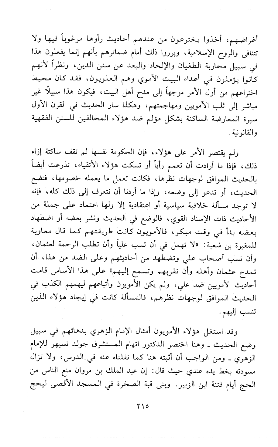 وقد استغل هؤلاء الأُمَوِيُّونَ أمثال الإمام الزُّهْرِي بدهائهم في سبيل وضع الحديث - وهنا اختصر الدكتور اتهام المستشرق جولدتسيهر للامام الزُّهْرِي - ومن الواجب أنْ أثبته هنا كما نقلناه عنه في الدرس، ولا تزال مسودته بخط يده عندي حيث قال: إن عبد الملك بن مروان منع الناس من الحج أيام فتنة ابن الزبير. وبنى قبة الصخرة في المسجد الأقصى ليحج