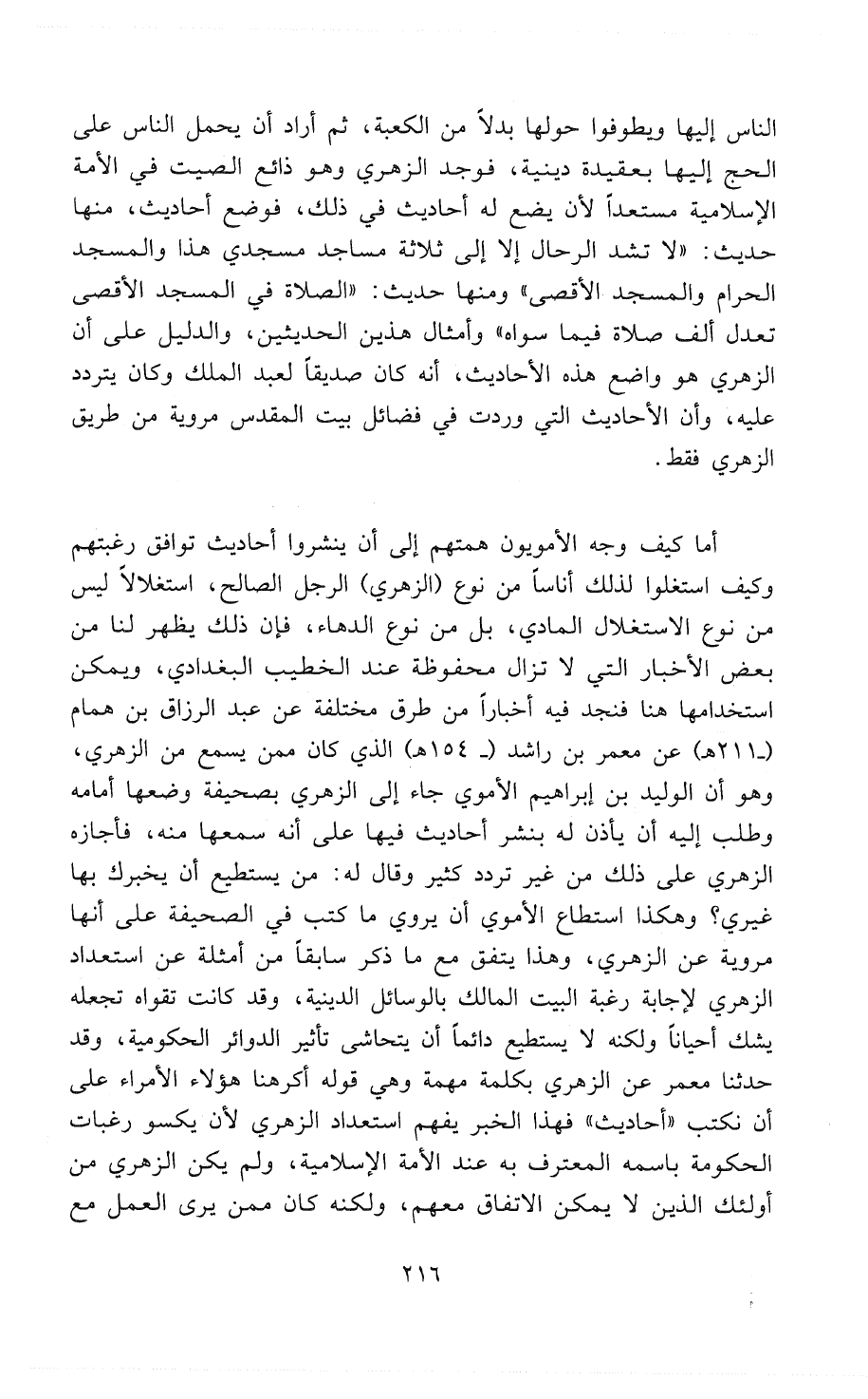 الناس إليها ويطوفوا حولها بدلاً من الكعبة، ثم أراد أن يحمل الناس على الحج إليها بعقيدة دينية، فوجد الزُّهْرِي وهو ذائع الصيت في الأُمَّة الاسلامية مستعداً لأن يضع له أحاديث في ذلك، فوضع أحاديث، منما حديث: «لاَ تُشَدُّ الرِّحَالُ إِلاَّ إِلَى ثَلاَثَةِ مَسَاجِدَ مَسْجِدِي هَذَا وَالْمَسْجِدِ الْحَرَامِ وَالْمَسْجِدِ الأَقْصَى». ومنها حديث: «الصَلاَةُ فِي المَسْجِدِ الأَقْصَى تَعْدِلُ أَلْفَ صَلاَةٍ فِيمَا سِوَاهُ» وأمثال هذين الحديثين، والدليل على أن الزُّهْرِي هو واضع هذه الأحاديث، أنه كان صديقاً لعبد الملك وكان يتردد عليه، وأنَّ الأحاديث التي وردت في فضائل بيت المقدس مروية من طريق الزُّهْرِي فقط.
