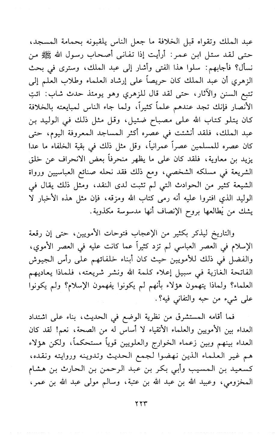 فما أقامه المستشرق من نظرية الوضع في الحديث، بناء على اشتداد العداء بين الأُمَوِيِّينَ والعلماء الأتقياء لا أساس له من الصِحَّةِ، نعم! لقد كان العِدَاءُ بينهم وبين زعماء الخوراج والعَلَوِيِّينَ قوياً مُسْتَحُكْمًا، ولكن هؤلاء هُمْ غير العلماء الذين نهضوا لجمع الحديث وتدوينه وروايته ونقده، كسعيد بن المسيب وأبي بكر بن عبد الرحمن بن الحارث بن هشام المخزومي، وَعُبَيْدَ اللهِ بن عبد الله بن عُتبة، وسالم مولى عبد الله بن عمر،