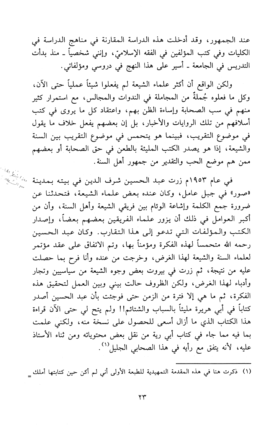 في عام 1953 زرت عَبْدَ الحُسَيْنَ شَرَفَ الدِّينِ في بيته بمدينة «صور» في جبل عامل، وكان عنده بعض علماء الشِيعَةِ، فَتَحَدَّثْنَا عن ضرورة جمع الكلمة وإشاعة الوئام بين فريقي الشِيعَةِ وَأَهْلِ السُنَّةِ، وأن من أكبر العوامل في ذلك أن يزور علماء الفريقين بعضهم بعضاً، وإصدار الكتب والمؤلفات التي تدعو إلى هذا التقارب. وكان عَبْدُ الحُسَيْن - رَحِمَهُ اللهُ - مُتَحَمِّسًا لهذا الغرض، وخرجت من عنده وأنا فرح بما حصلت عليه من نتيجة، ثم زُرْتُ في بيروت بَعْضَ وجوه الشِيعَةِ من سياسيين وَتُجَّارَ وأدباء لهذا الغرض، ولكن الظروف حالت بيني وبين العمل لتحقيق هذه الفكرة، ثم ما هي إلا فترة من الزمن حتى فوجئت بأن عَبْدَ الحُسَيْنِ أصدر كتاباً في أبي هريرة (*) مليئاً بالسباب والشتائم!! ولم يتح لي حتى الآن قراءة هذا الكتاب الذي ما أزال أسعى للحصول على نسخة منه، ولكني علمت بما فيه مِمَّا جاء في كتاب أَبِي رَيَّةَ من نقل بعض محتوياته ومن ثناء الأستاذ عليه، لأنه يتفق مع أَبِي رَيَّةَ في هذا الصحابي الجليل (¬1)