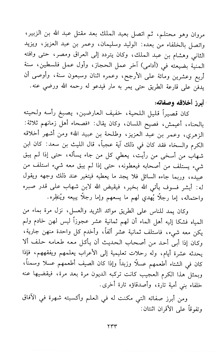 مروان وهو محتلم، ثم اتصل بعبد الملك بعد مقتل عبد الله بن الزبير، واتصل بالخلفاء من بعده: الوليد وسليمان، وعمر بن عبد العزيز، ويزيد الثاني وهشام بن عبد الملك، وكان يتردد إلى العراق ومصر، حتى وافته المَنِيَّةُ بضيعته في (أدامي) آخر عمل الحجاز، وأول عمل فلسطين، سَنَةَ أربع وعشرين ومائة على الأرجح، وعمره اثنان وسبعون سَنَةً، وأوصى أنْ يدفن على قارعة الطريق حتى يَمُرَّ به مَارٌّ فيدعو له - رَحِمَهُ اللهُ ورَضِيَ عَنْهُ -.