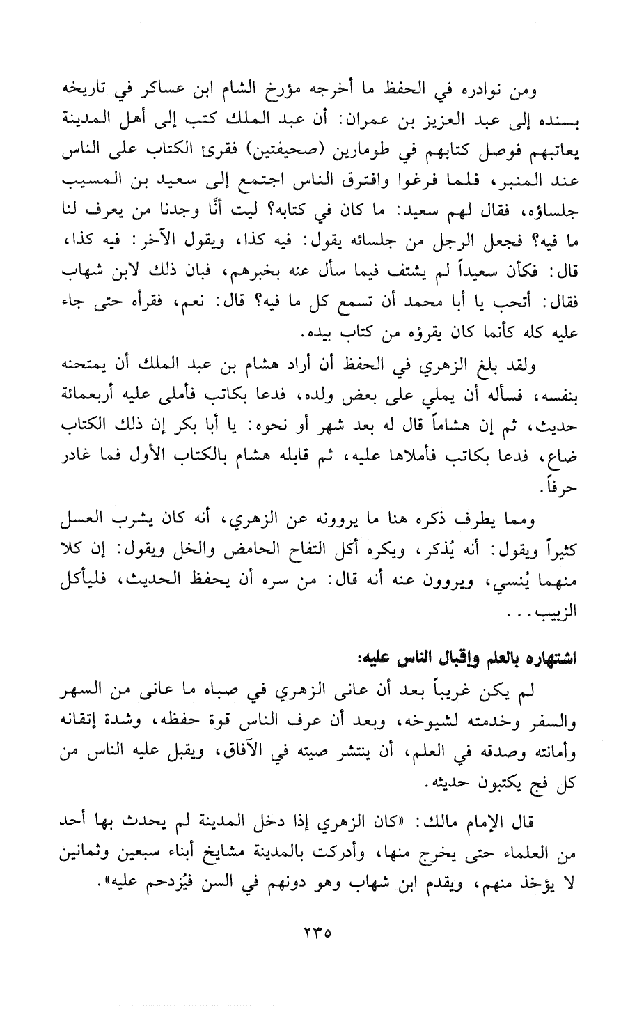 ولقد بلغ الزُّهْرِيُّ في الحفظ أنْ أراد هشام بن عبد الملك أنْ يمتحنه بنفسه، فسأله أنْ يُمْلِي على بعض ولده، فدعا بكاتب فأملى عليه أربعمائة حديث، ثم إنَّ هشاماً قال له بعد شهر أو نحوه: «يَا أَبَا بَكْرٍ إنَّ ذَلِكَ الكِتَابَ ضَاعَ»، فدعا بكاتب فأملاها عليه، ثم قابله هشام بالكتاب الأول فما غادر حرفاً.