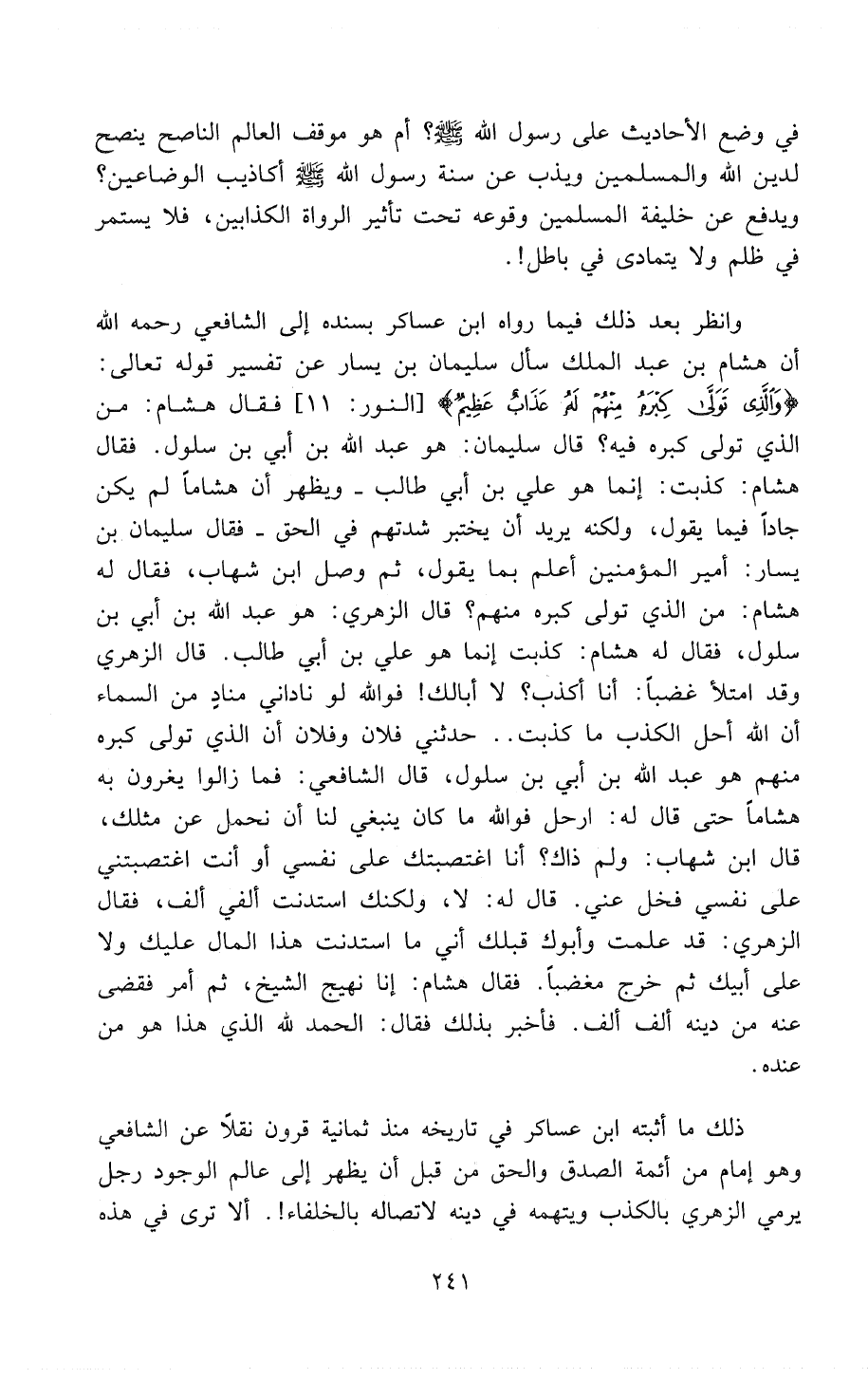ذلك ما أثبته ابن عساكر في " تاريخه " منذ ثمانية قرون نقلاً عن الشافعي وهو إمام من أئمة الصدق والحق من قبل أن يظهر إلى عالم الوجود رجل يرمي الزُّهْرِي بالكذب وَيَتَّهِمَهُ في دينه لاتصاله بالخلفاء!. ألاَ ترى في هذه